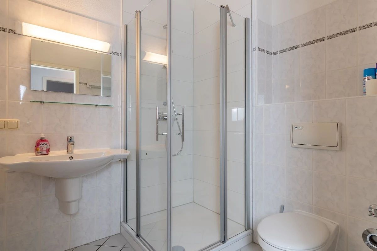 Das Badezimmer ist mit einer Eckdusche eingerichtet.