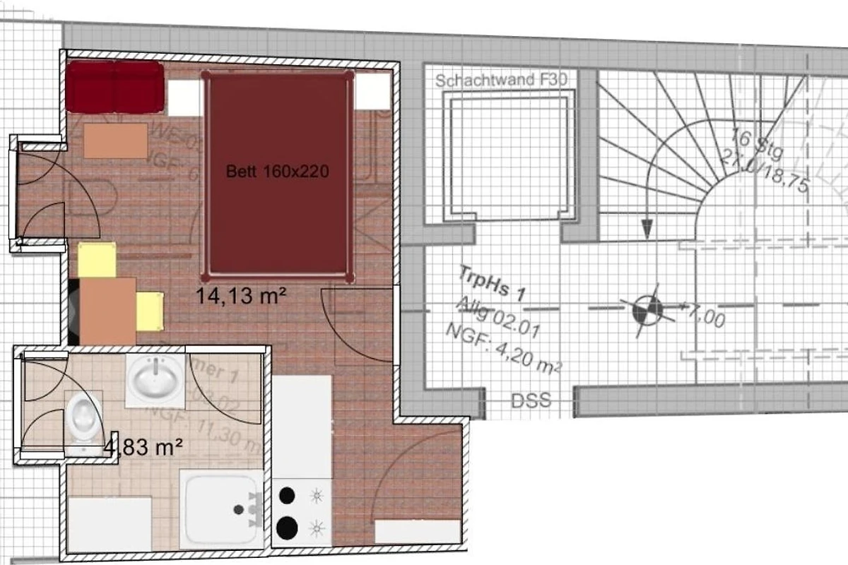 Unsere gemütlich eingerichtete Wohnung Ecke 4 mit ihren 20 m² gleicht einem Hotelzimmer gehobener Klasse, da Sie zusätzlich eine integrierte Küchenzeile nutzen können. Diese ist mit einer Mikrowelle, einem 2-Zonen Kochfeld, Kühlschrank sowie einer Kaffeemaschine ausgestattet.