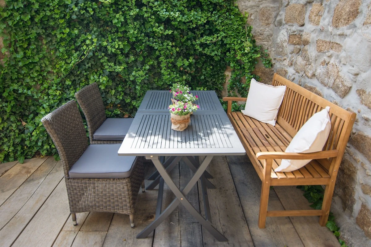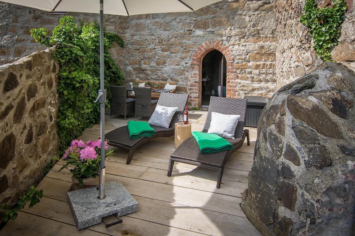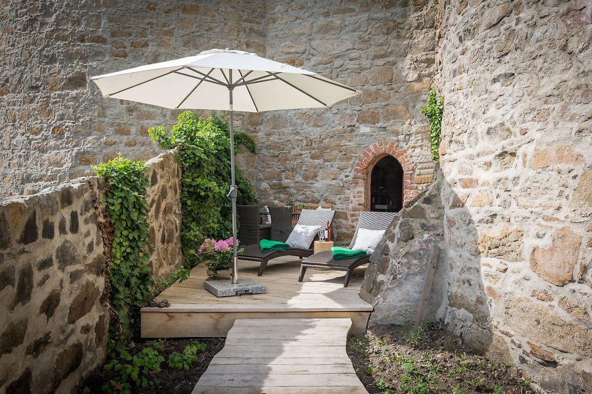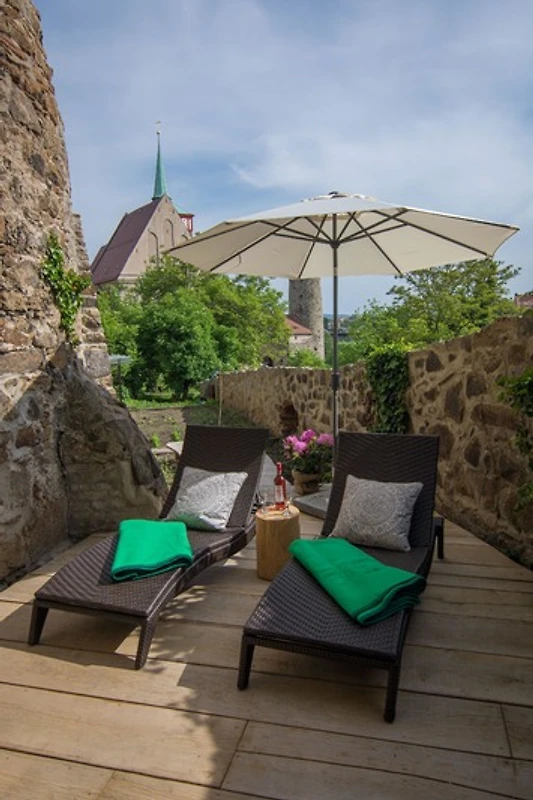 Die Suite besitzt insgesamt zwei eigene Aussenbereiche, einer modernen Terasse mit Blick auf die historische Umgebung, sowie einem Aussenbereich direkt am Reymanweg der Stadtmauer Bautzens.