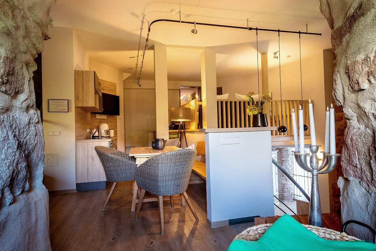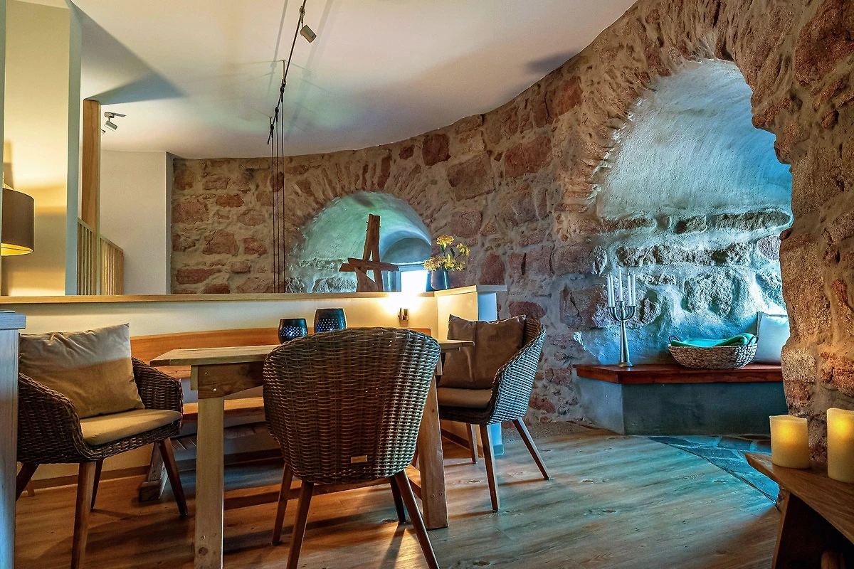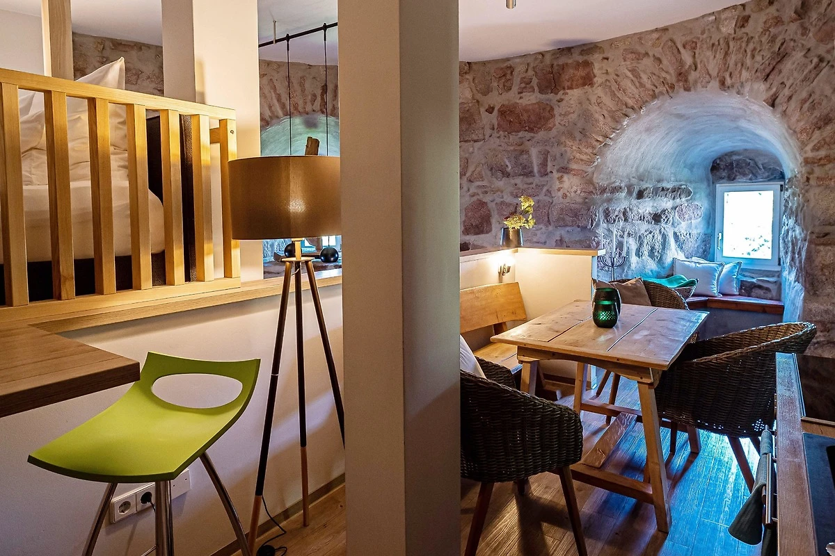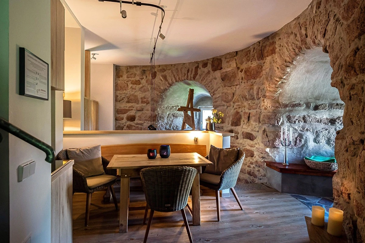Die Suite besteht aus einer offenen zweietagigen Galerie, einem eigenen Wellnessbereich mit finnischer Sauna und freistehender Wanne, umrandet von 500 Jahre altem und liebevoll restaurierten Natursteinmauerwerk, welches dem Rundbau einen eigenen Charme verleiht. Im Oberrang der Galerie befindet sich eine vollausgestattete moderne Küche mit einem gemütlichen Frühstücksbereich sowie einem einladenenden Hochbett auf einer freistehenden hölzernen Plattform mit Blick in den durch eine Glastür abgetrenten Wellnessbereich. Unterhalb des Hochbetts, im unteren Teil der Galerie befindet sich eine gemütliche Kuschelecke, welche auch als Schlafgelegenheit für weitere Gäste geeignet ist.
