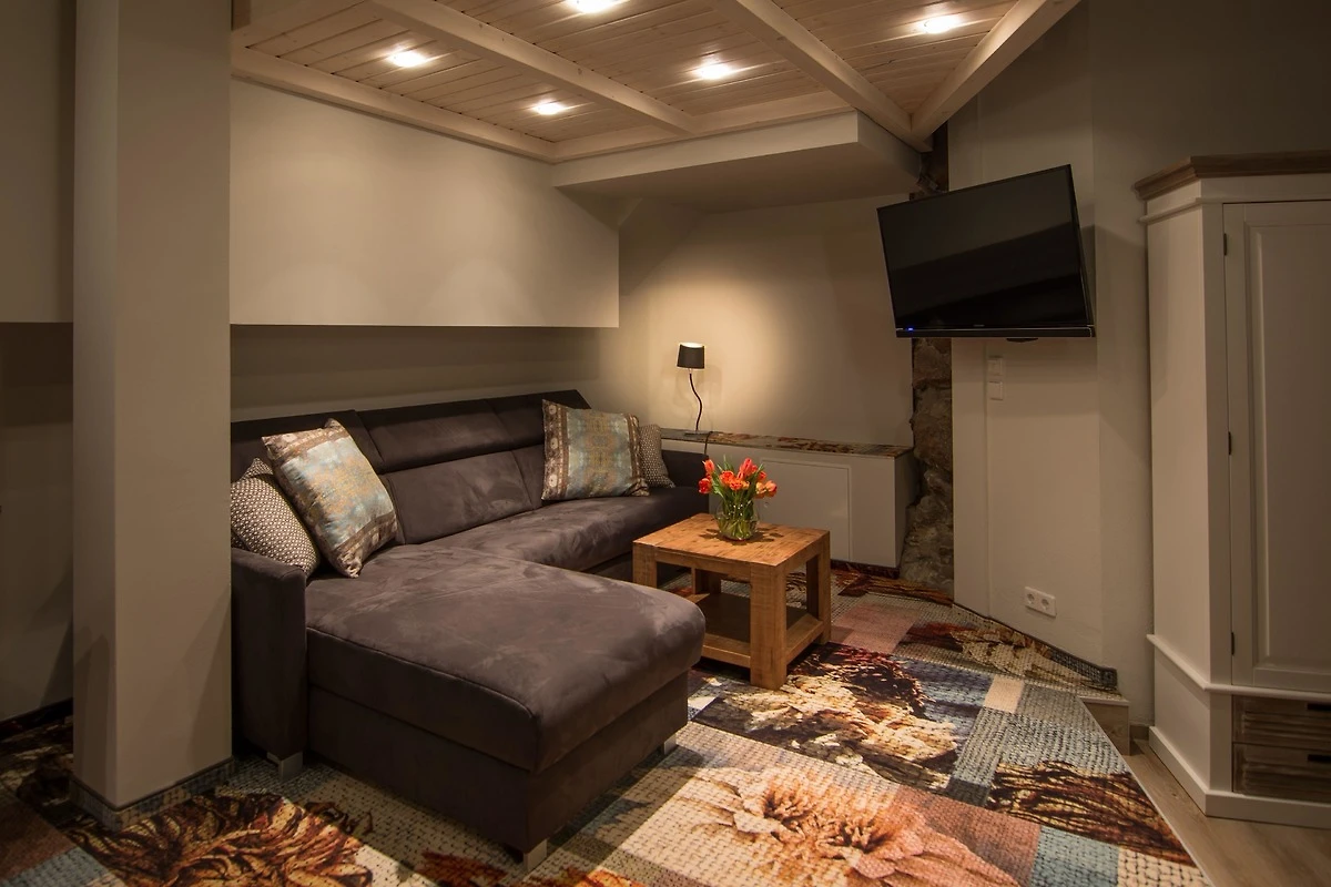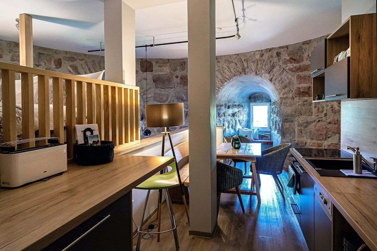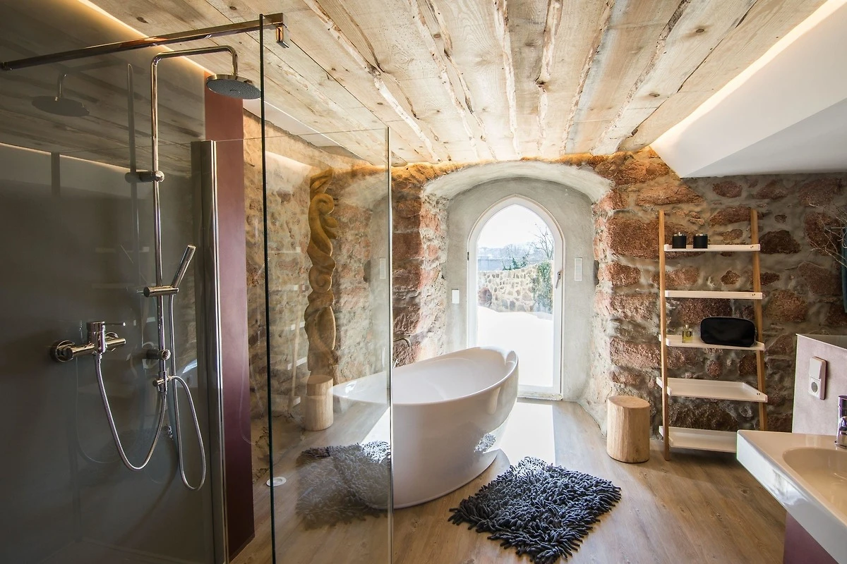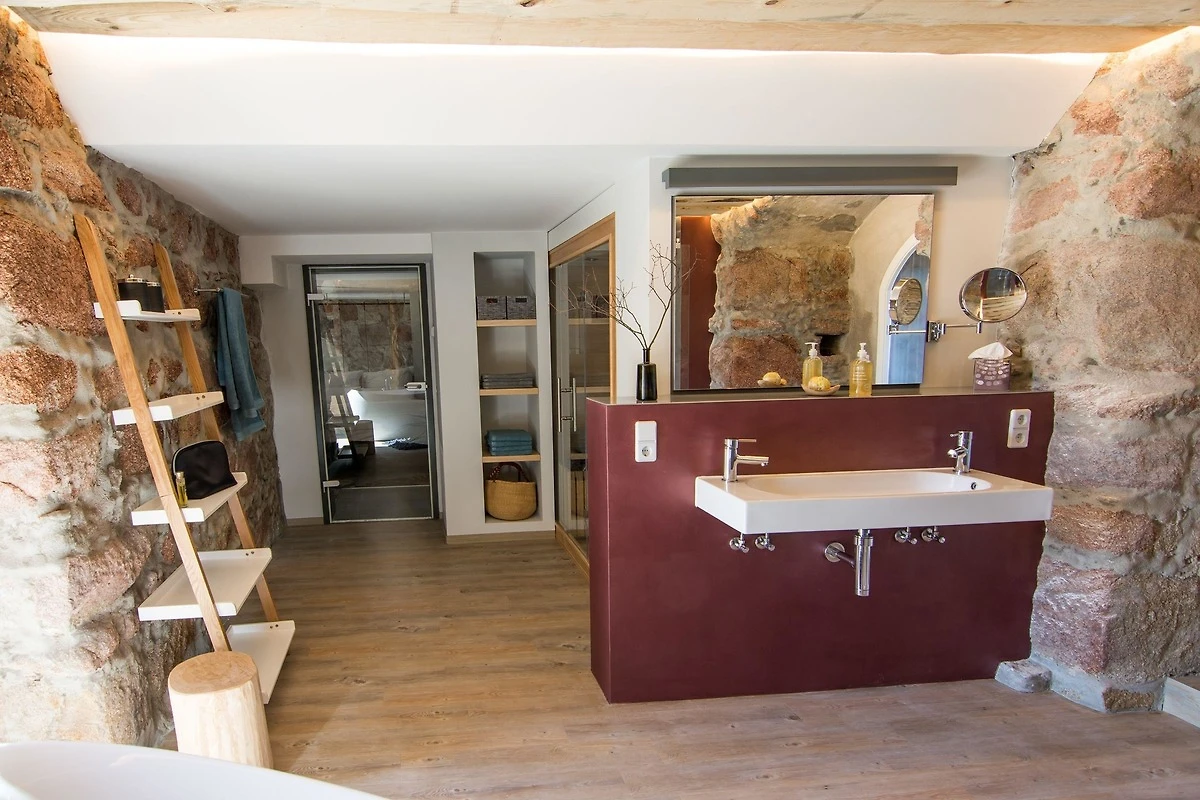 Die Suite besteht aus einer offenen zweietagigen Galerie, einem eigenen Wellnessbereich mit finnischer Sauna und freistehender Wanne, umrandet von 500 Jahre altem und liebevoll restaurierten Natursteinmauerwerk, welches dem Rundbau einen eigenen Charme verleiht. Im Oberrang der Galerie befindet sich eine vollausgestattete moderne Küche mit einem gemütlichen Frühstücksbereich sowie einem einladenenden Hochbett auf einer freistehenden hölzernen Plattform mit Blick in den durch eine Glastür abgetrenten Wellnessbereich. Unterhalb des Hochbetts, im unteren Teil der Galerie befindet sich eine gemütliche Kuschelecke, welche auch als Schlafgelegenheit für weitere Gäste geeignet ist.