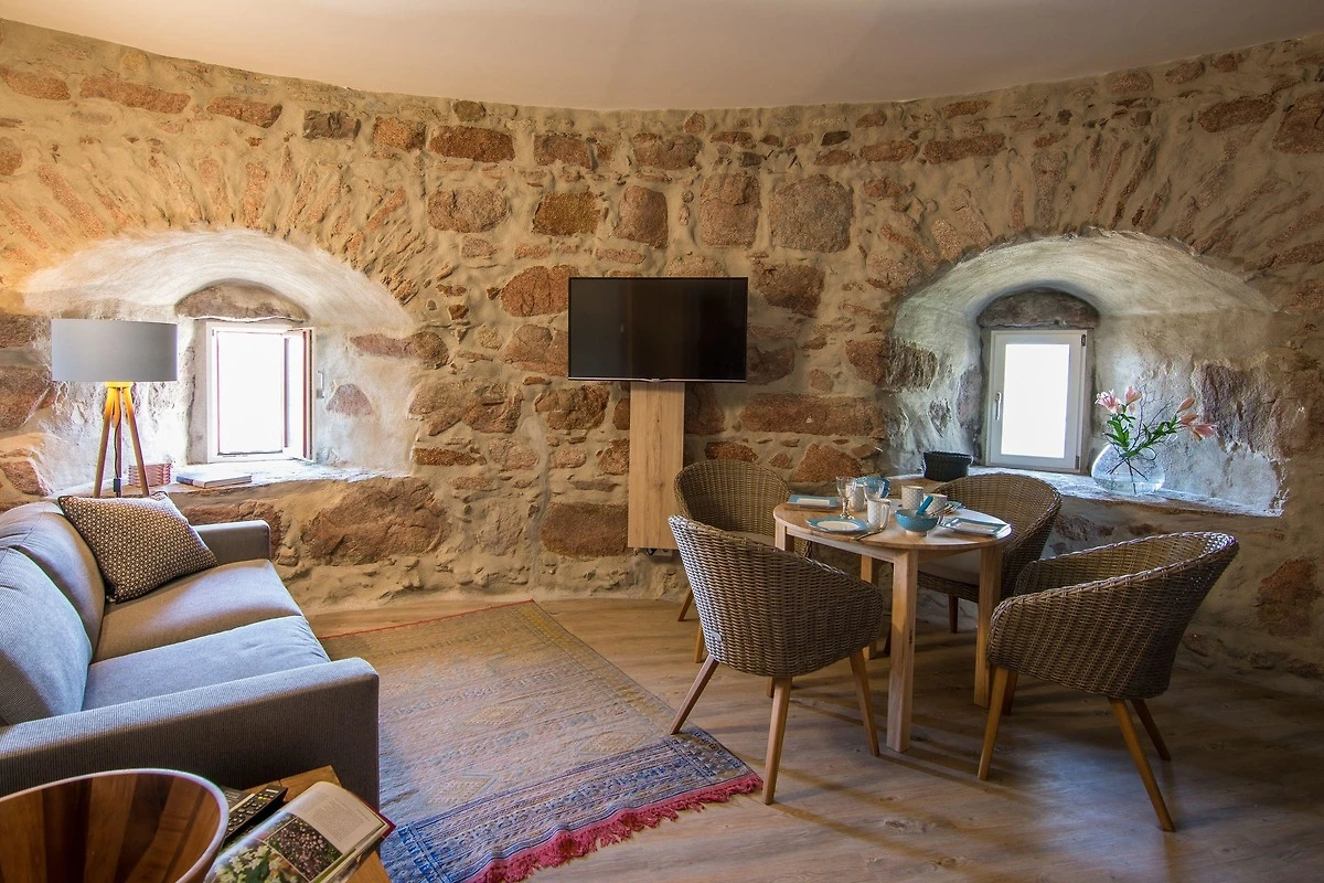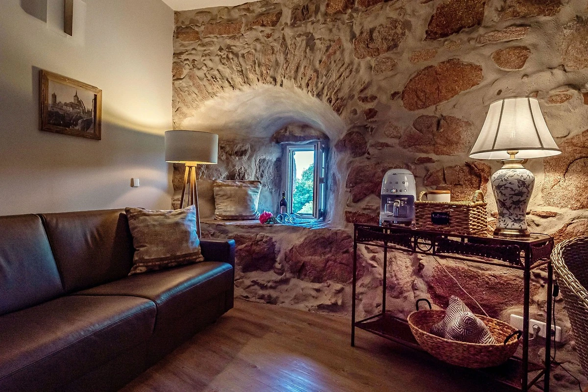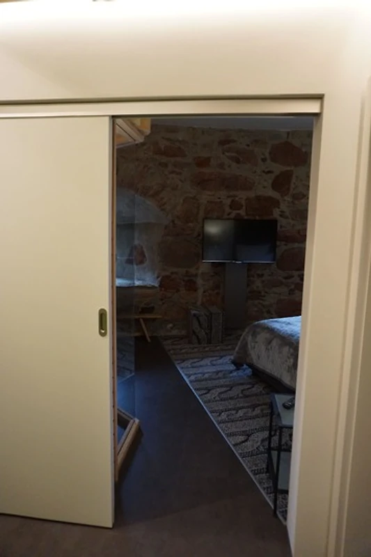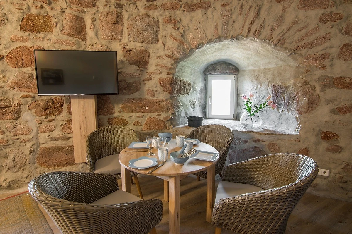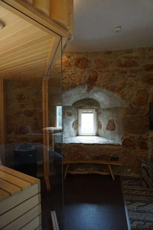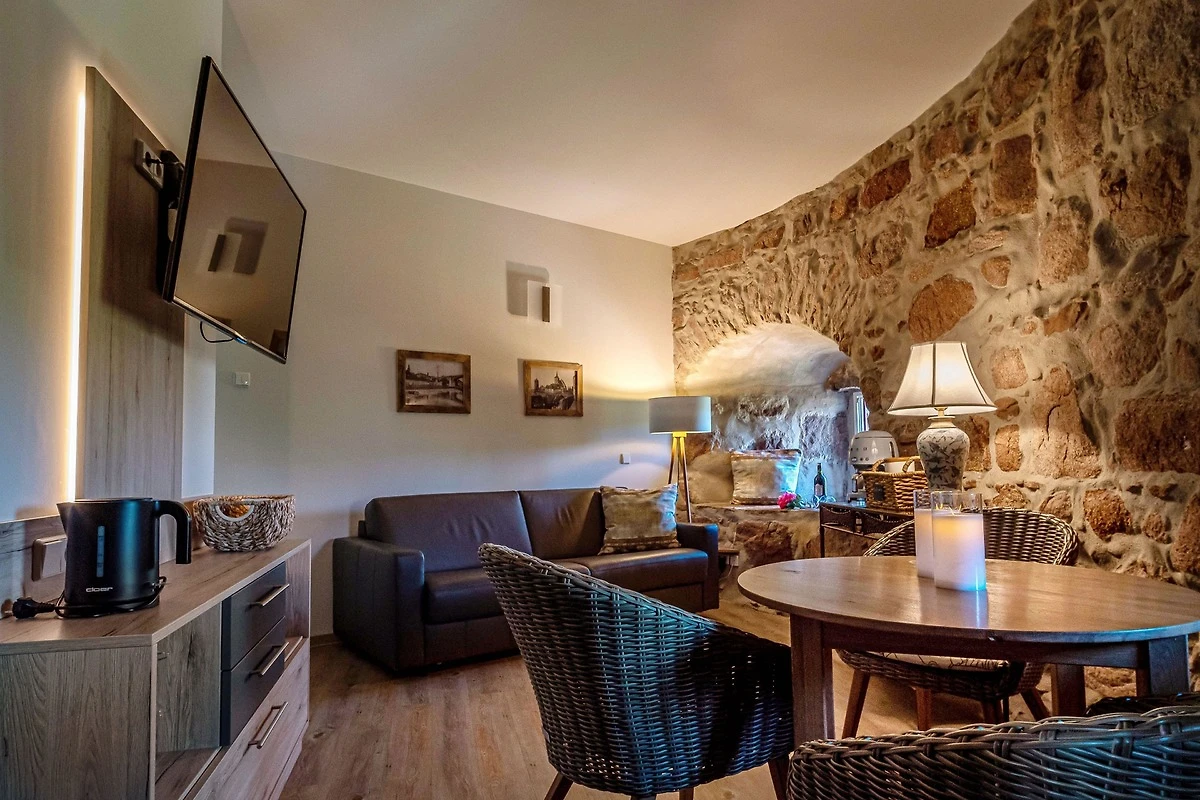 Das Apartment gliedert sich in ein Schlafzimmer mit Doppelbett und Sauna und einem Wohnzimmer mit Küche und Bett. Das Apartment verbindet den historischen Charme 500 Jahre alten Natursteinmauerwerks mit einer modernen und hellen Einrichtung.