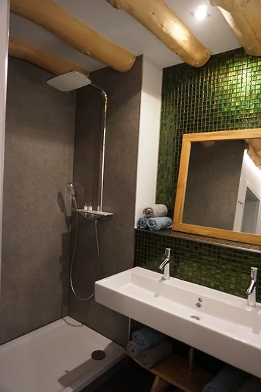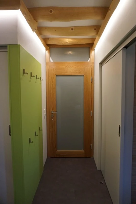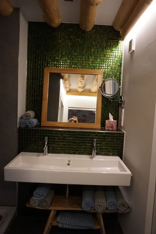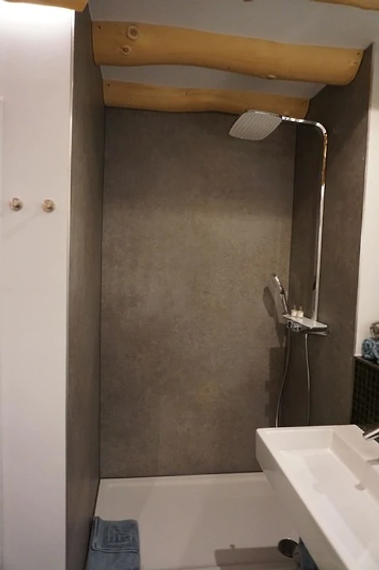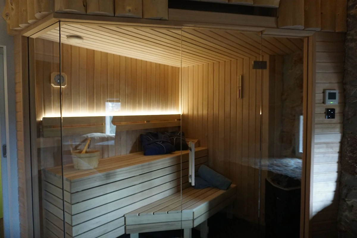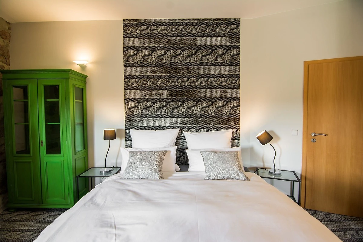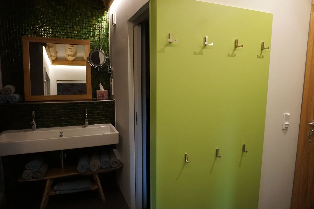 Das Apartment gliedert sich in ein Schlafzimmer mit Doppelbett und Sauna und einem Wohnzimmer mit Küche und Bett. Das Apartment verbindet den historischen Charme 500 Jahre alten Natursteinmauerwerks mit einer modernen und hellen Einrichtung.