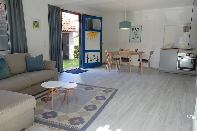 Der vom Meer immer neu angelandete Sand am Nordstrand ist so fein wie in der Karibik und liegt nur 15 Gehminuten entfernt. Die Häuser sind zum Teil reetgedeckt, wie es typisch ist für die Ostseeregion.