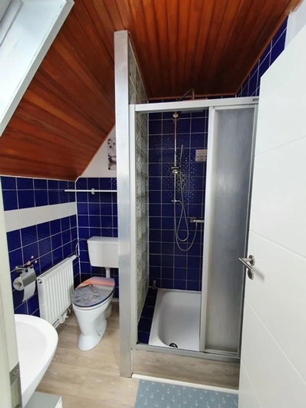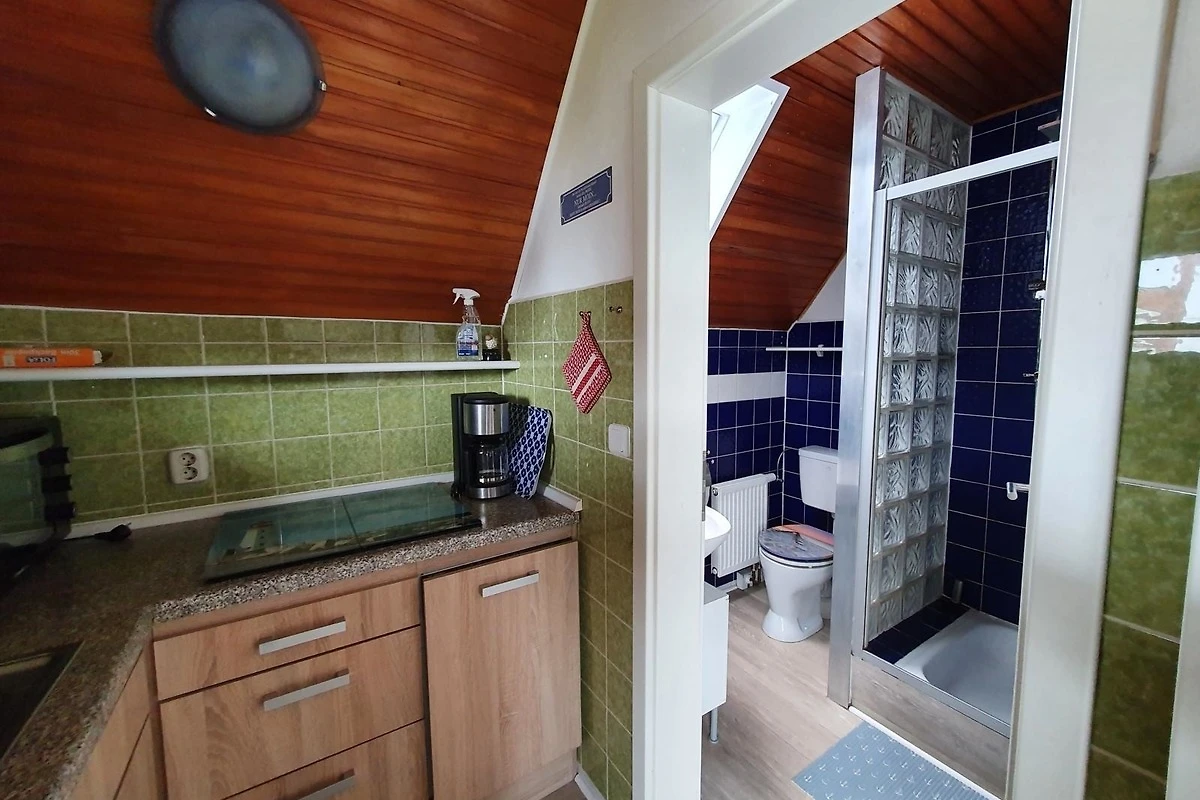 Im kleinen Badezimmer waren wir auf Stauraum bedacht. Ein Fön ist vorhanden, zudem finden Sie eine Regenschauerdusche mit Handbrause und ein niedriges kinder- und seniorenfreundliches Waschbecken vor.