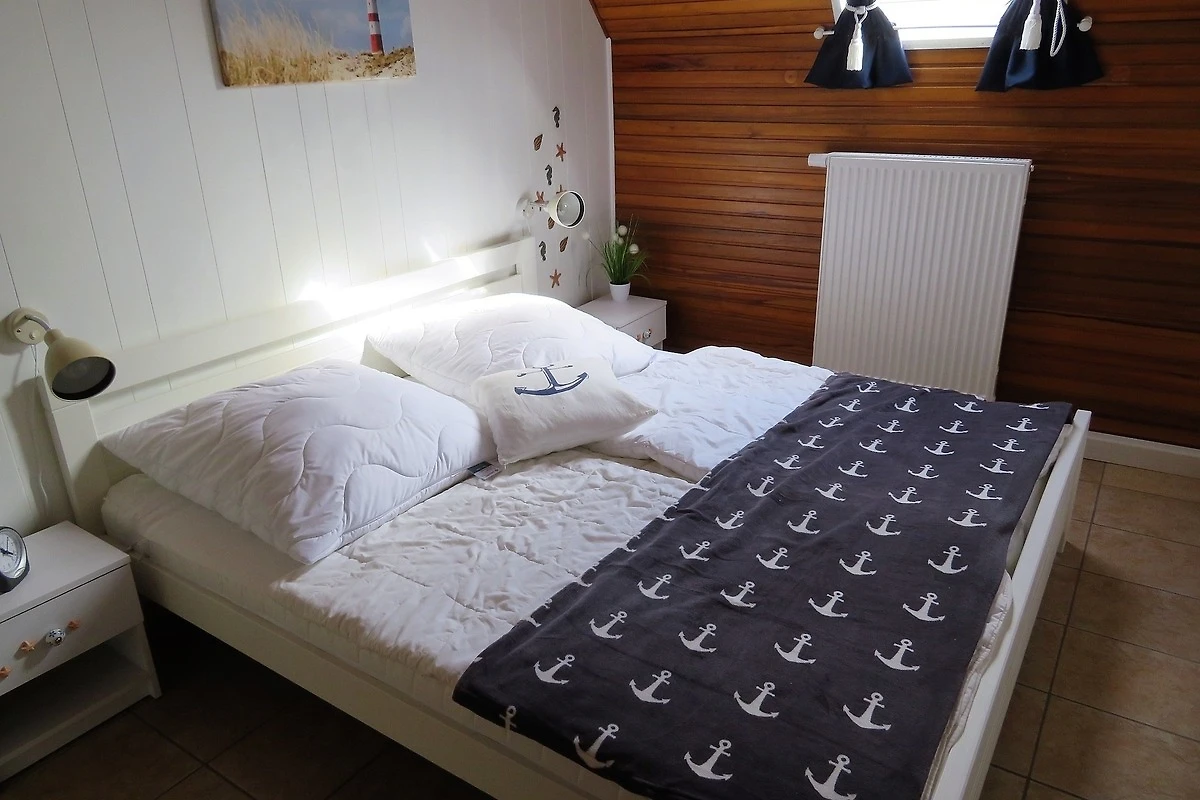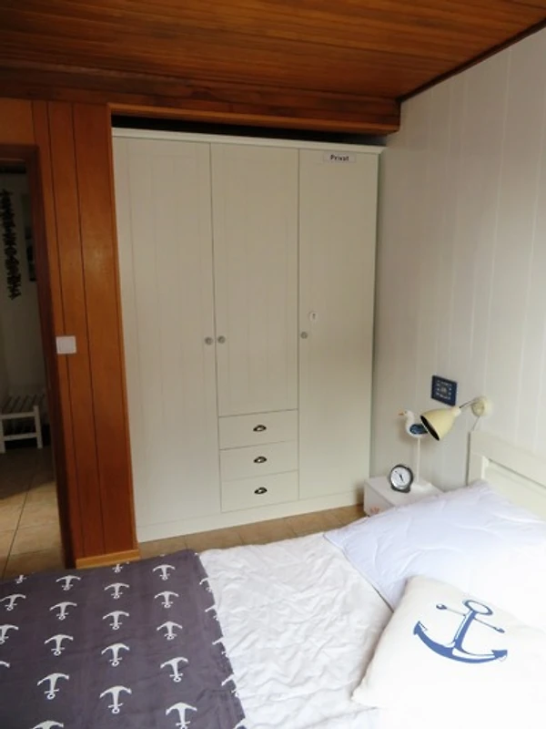 Das Schlafzimmer im EG ist einfach nur gemütlich. Ein Doppelbett mit Kaltschaummatratzen, Nachttisch, Leselampe und Kleiderschrank mit integriertem Tresor zur kostenfreien Benutzung befinden sich dort.