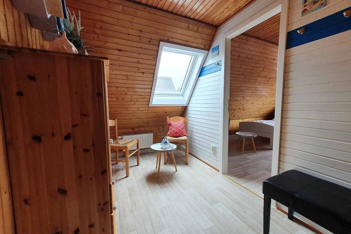 Das Schlafzimmer im OG mit seinem grossen Dreieckfenster Richtung Südwesten verfügt über ein Doppelbett mit Nachttisch und Leselampe, SAT-TV Flachfernseher. Eine separater Ankleidebereich mit Stühlen befindet sich vor dem Schlafzimmer. Im OG ist auch der Lesebereich mit Sitzmöglichkeiten, Leselampe und Büchern für Gross und Klein.