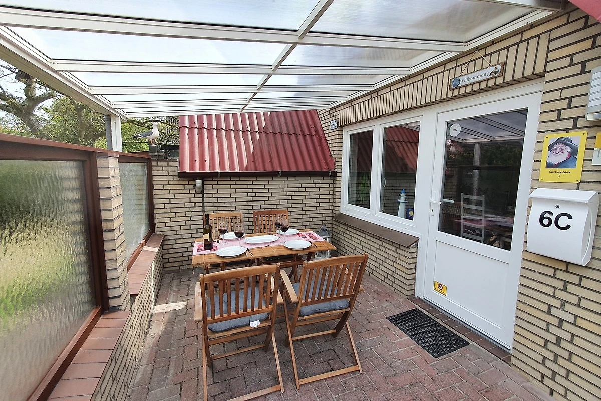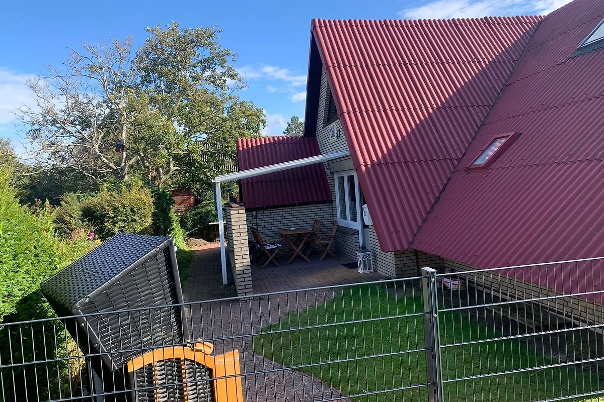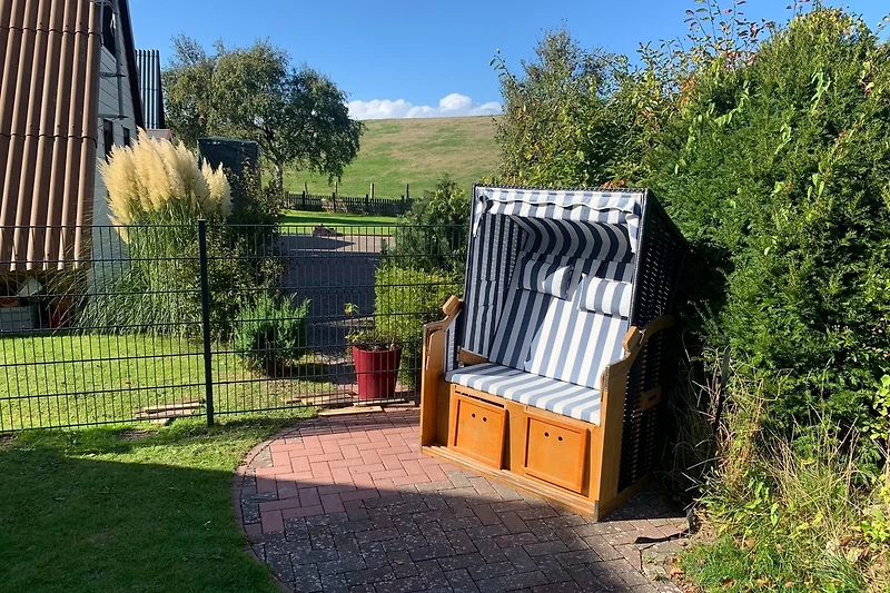 Strandkorb und Kugelgrill sind ebenfalls vorhanden. Fahrräder finden Platz unter der überdachten Terrasse. Eine kleine Gartenfläche vor dem Haus rundet das Aussenangebot ab.