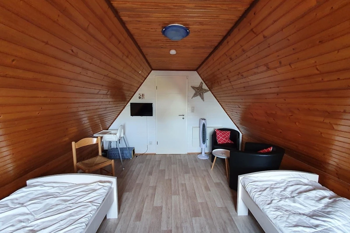 Two twin beds with nightstand and reading lamp, Satellite-TV and wardrobe. Additional Hauck portacrib (bed for baby / infant till age of 3) is available free of charge.