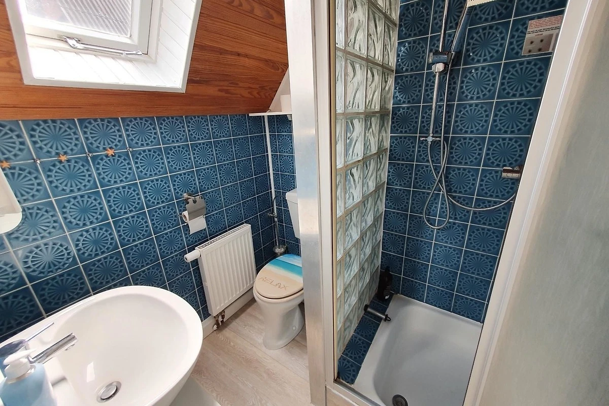 Im Badezimmer mit Tageslicht waren wir auf Stauraum bedacht. Ein Fön ist vorhanden, zudem finden Sie eine Regenschauerdusche mit Handbrause und ein niedriges kinder- und seniorenfreundliches Waschbecken vor.