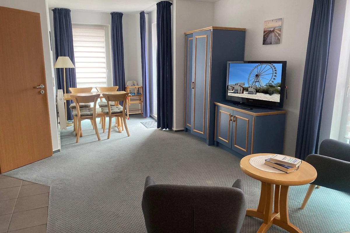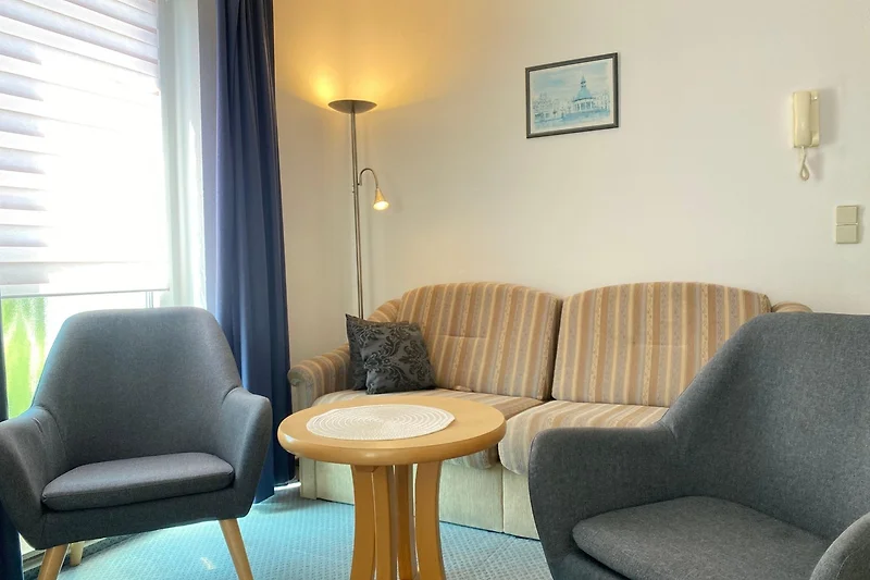 Der Wohnbereich ist mit einer kuscheligen Sofa- und Sesselecke eingerichtet. Hier können Sie nach einem ereignisreichen Urlaubstag entspannen und das Fernsehprogramm geniessen. Hierfür steht Ihnen ein Flachbildschirm-TV zur Verfügung.