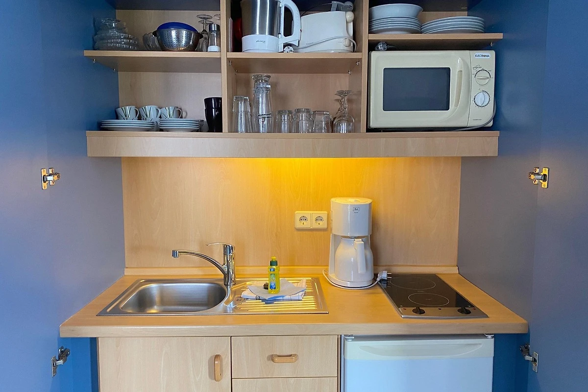 An den Wohnbereich grenzt sowohl der Esstisch für die gemeinsamen Mahlzeiten als auch die kleine Küchenzeile, die mit einem 2-Platten-Herd, einem Toaster, einer Kaffeemaschine und einem Wasserkocher ausgestattet ist. Natürlich ist auch ausreichend Geschirr vorhanden.