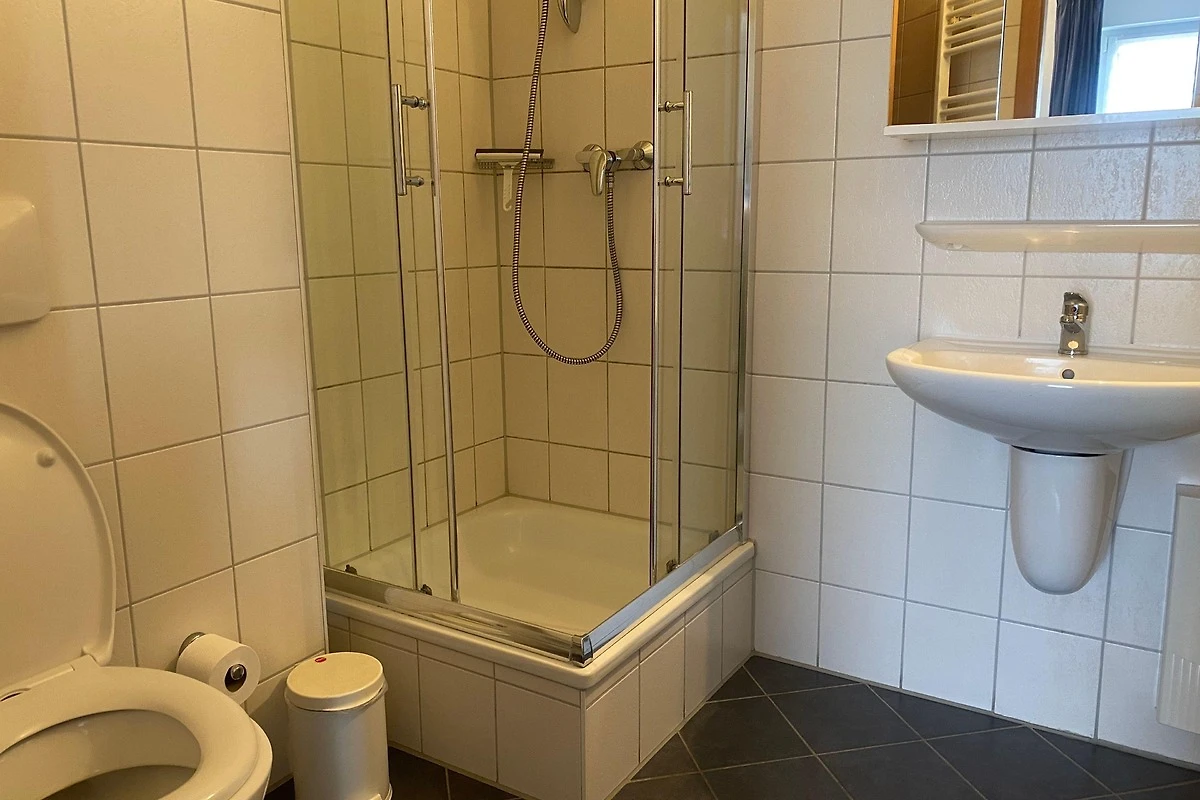 Das Badezimmer verfügt über eine Dusche, ein Waschbecken und ein WC.