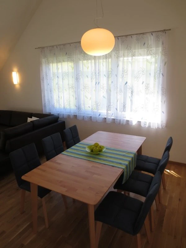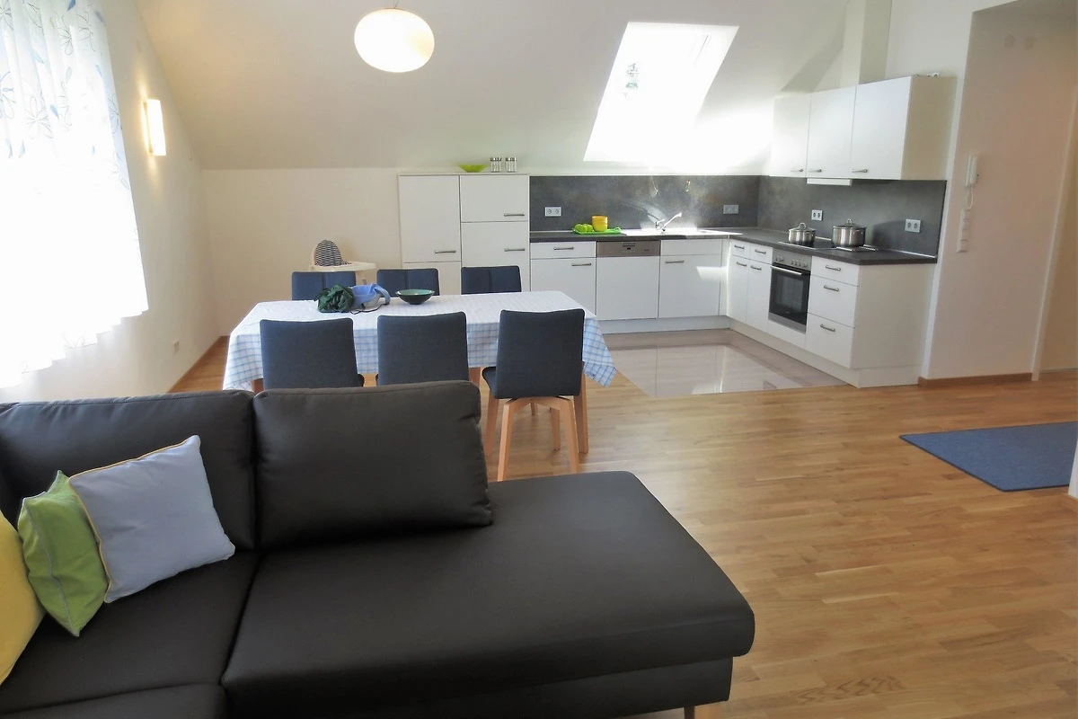 Der grosse Wohnraum beinnhaltet die moderne Einbauküche, den Esstisch und das grosse Ecksofa.