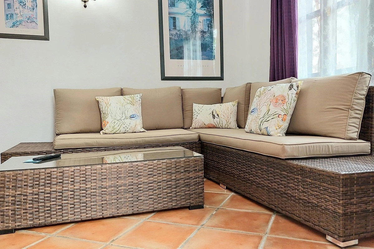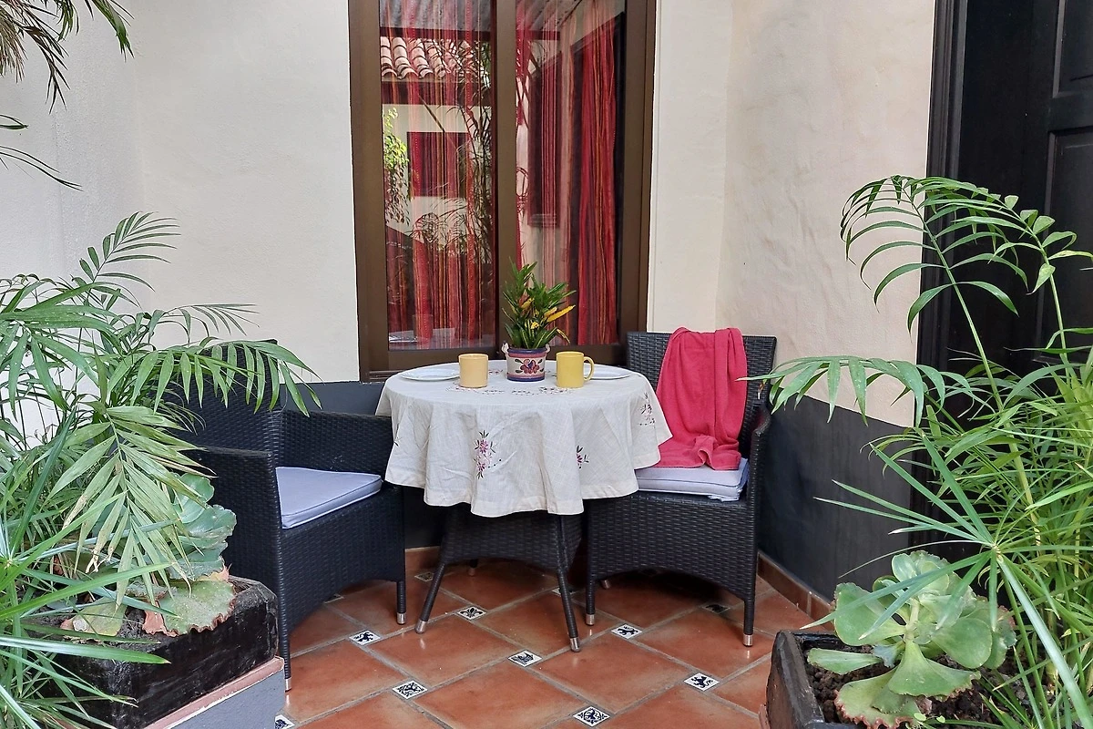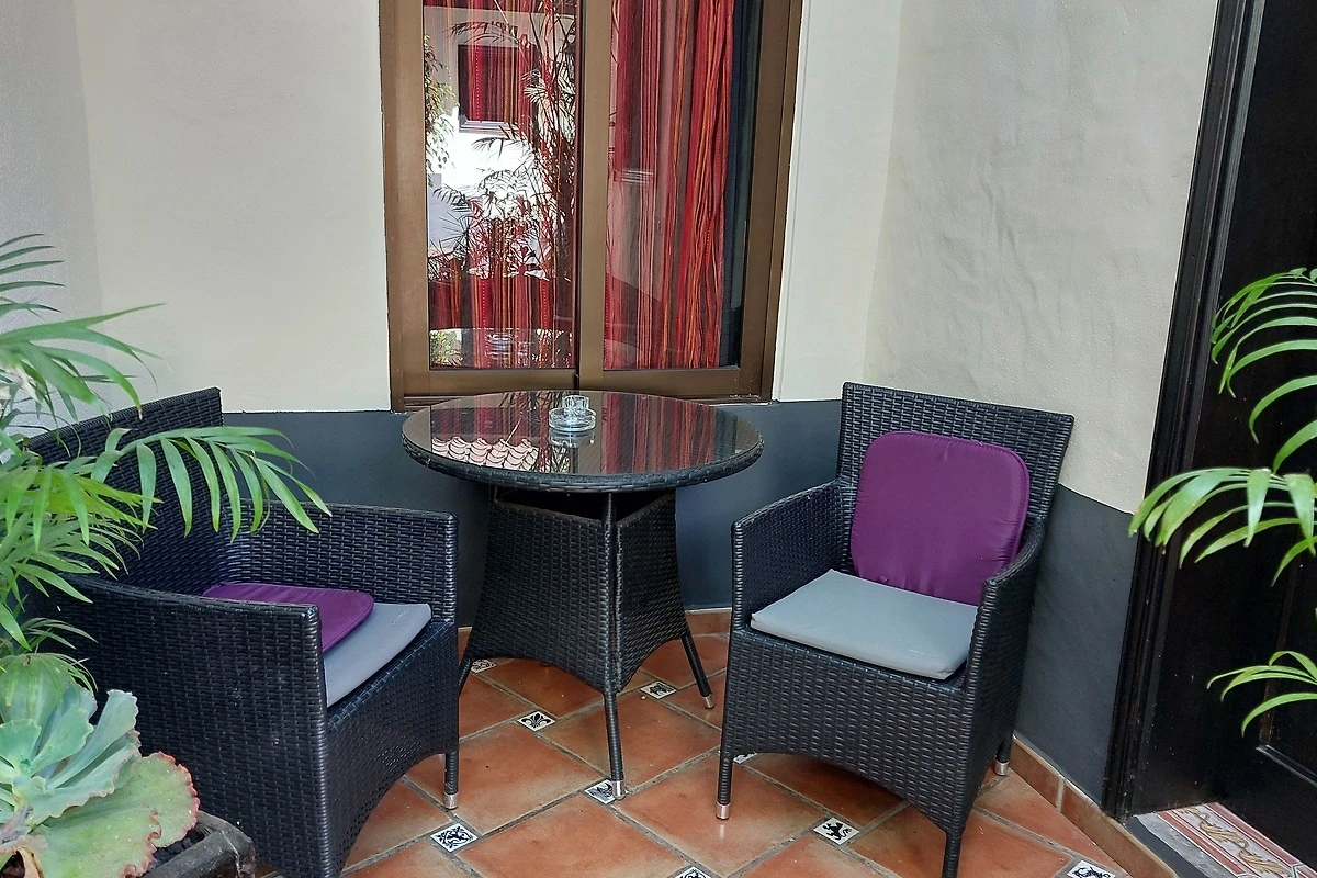 Mediterrane Ferienwohnung in Orange- und Violetttönen. Die Ferienwohnung verfügt über ein sehr ruhig gelegenes Schlafzimmer, ein stilvolles Wohnzimmer, eine kleine ans Wohnzimmer ohne Tür anschliessende Küche, ein Bad mit Dusche sowie eine gemütliche Sitzgelegenheit auf der kleinen Innenhof-Terrasse. Alle Fenster gehen zum Innenhof. Neben der eigenen kleinen Terrasse im Innenhof kann natürlich auch jederzeit die grosse Gemeinschafts-Dachterrasse genutzt werden. Der Flachbildfernseher verfügt über Satellitenempfang mit ca. 450 internationalen Sendern- darunter alle frei empfangbaren deutschen Kanäle - sowie durch Umschalten auf der Fernbedienung über DVB-T-Empfang mit den gängigen spanischen Fernsehsendern. Zudem kann auf Anfrage kostenlos Netflix bereitgestellt werden. Unser Haus verfügt über Internetanschluss per Glasfaser und in allen Unterkünften sowie auf der Dachterrasse steht sehr gut funktionierendes W-LAN zur kostenlosen Verfügung.