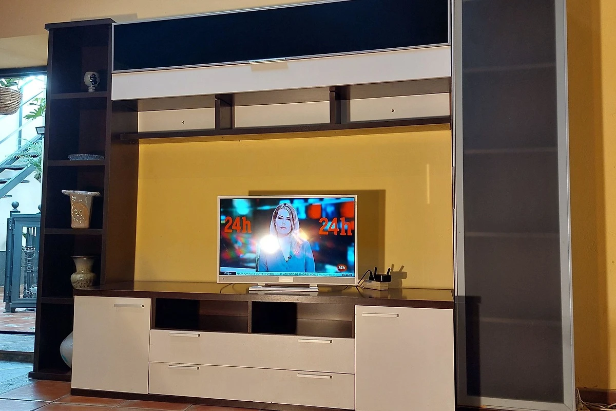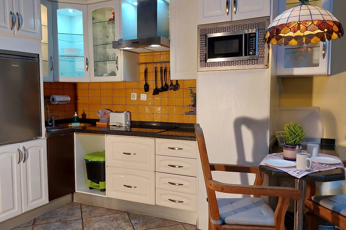 Die im modernen Stil eingerichtete Ferienwohnung liegt im ersten Stockwerk direkt zur Landstrasse auf nahezu Strassenniveau (Vierfachverglasung). Der Wohnbereich verfügt über eine grosse moderne und voll ausgestattete Küche (inkl. Mikrowelle), eine Esstheke sowie ein bequemes Sofa. Das Schlafzimmer ist mit einem 150 cm grossen französichen Bett ausgestattet. Das direkt anschliessende Badezimmer hat eine Dusche. Der Flachbildfernseher verfügt über Satellitenempfang mit ca. 450 internationalen Sendern- darunter alle frei empfangbaren deutschen Kanäle - sowie durch Umschalten auf der Fernbedienung über DVB-T-Empfang mit den gängigen spanischen Fernsehsendern. Zudem kann auf Anfrage kostenlos Netflix bereitgestellt werden. Unser Haus verfügt über Internetanschluss per Glasfaser und in allen Unterkünften sowie auf der Dachterrasse steht sehr gut funktionierendes W-LAN zur kostenlosen Verfügung. Der geringe Preis erklärt sich durch die Lage zur Strasse, durch die Lärmbelästigungen nicht ausgeschlossen werden können. Für lärmempfindliche Menschen ist dieses Apartment nicht geeignet.