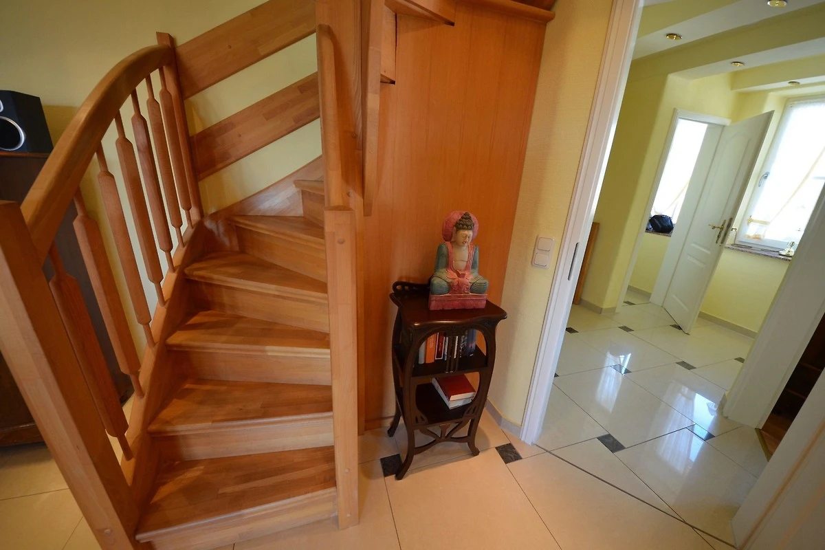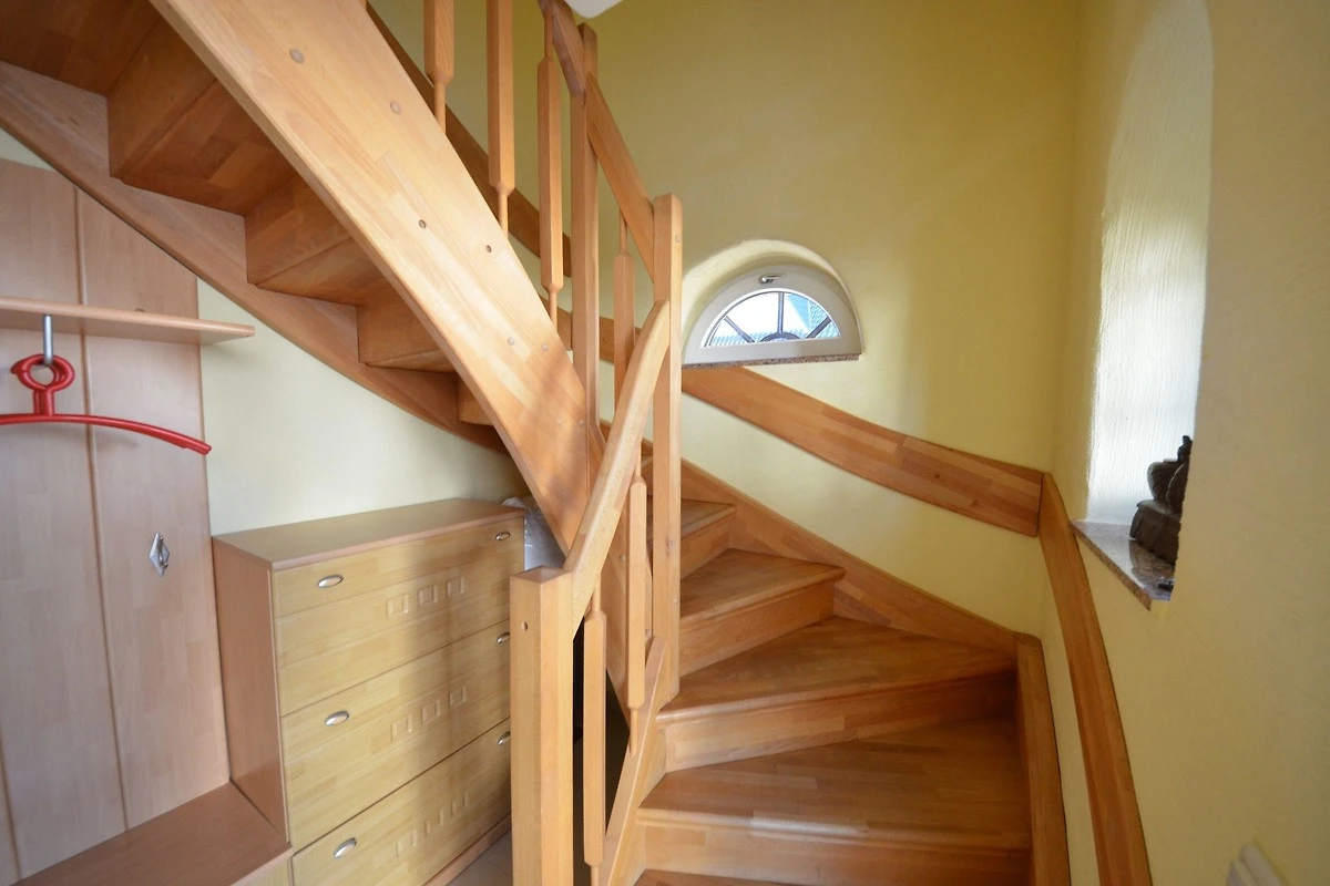 Von hier aus erreicht man durch eine schöne Holztreppe den Wohnbereich im OG.