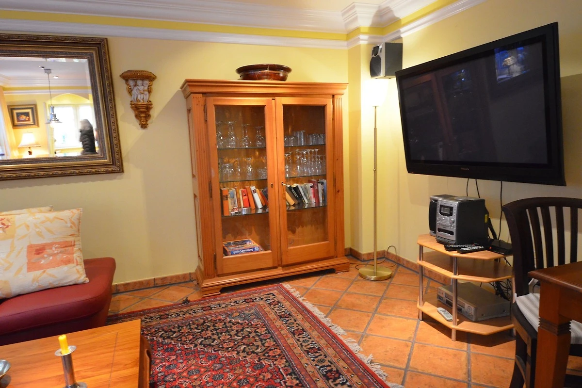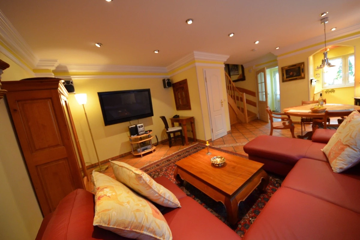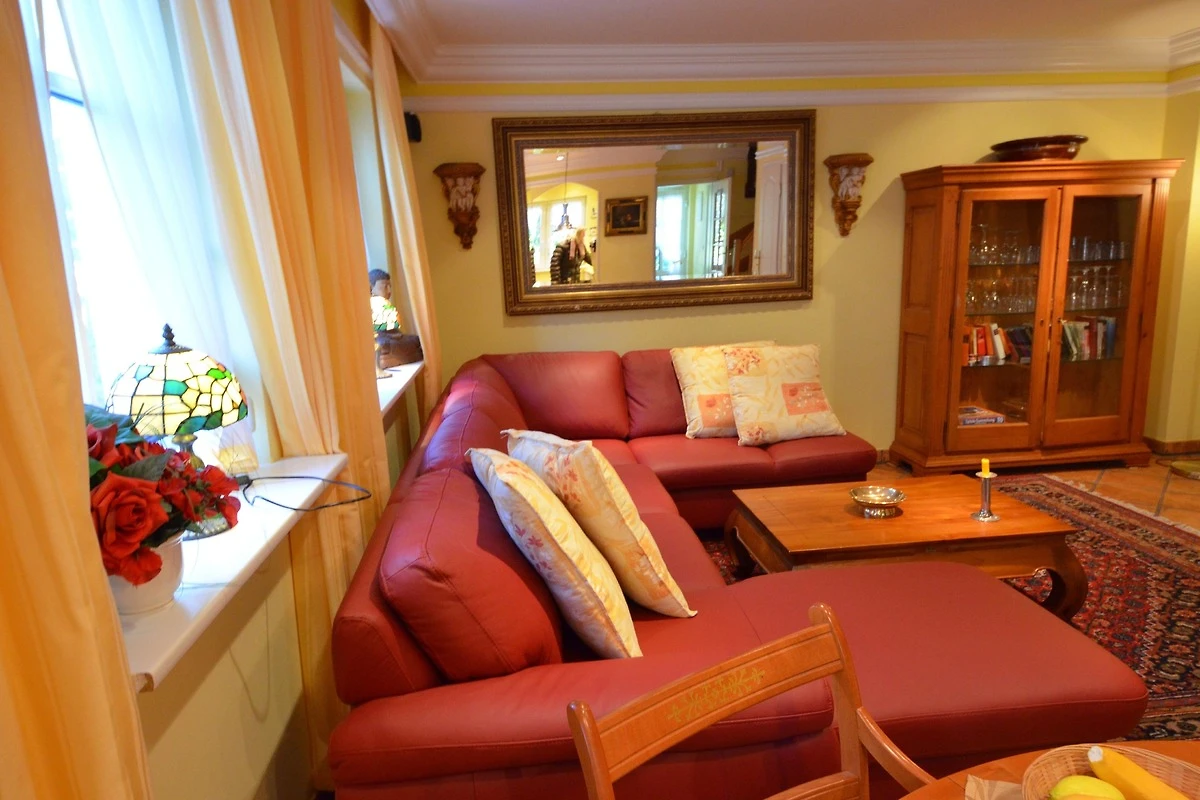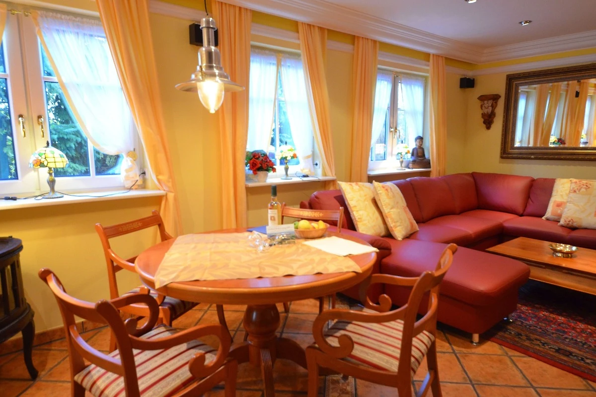 Gemütliches Wohn- Esszimmer, Fussbodenheizung, Esstisch für 4 Personen, schöne Leder-Couch-Garnitur und Opiumtisch, 50" (125cm) TV, WLAN, Stereo / CD, antiker Geschirrschrank, Telefontisch mit Telefon und balinesischem Spiegel, Kinderhochstuhl, Wände dekoriert mit Bildern,