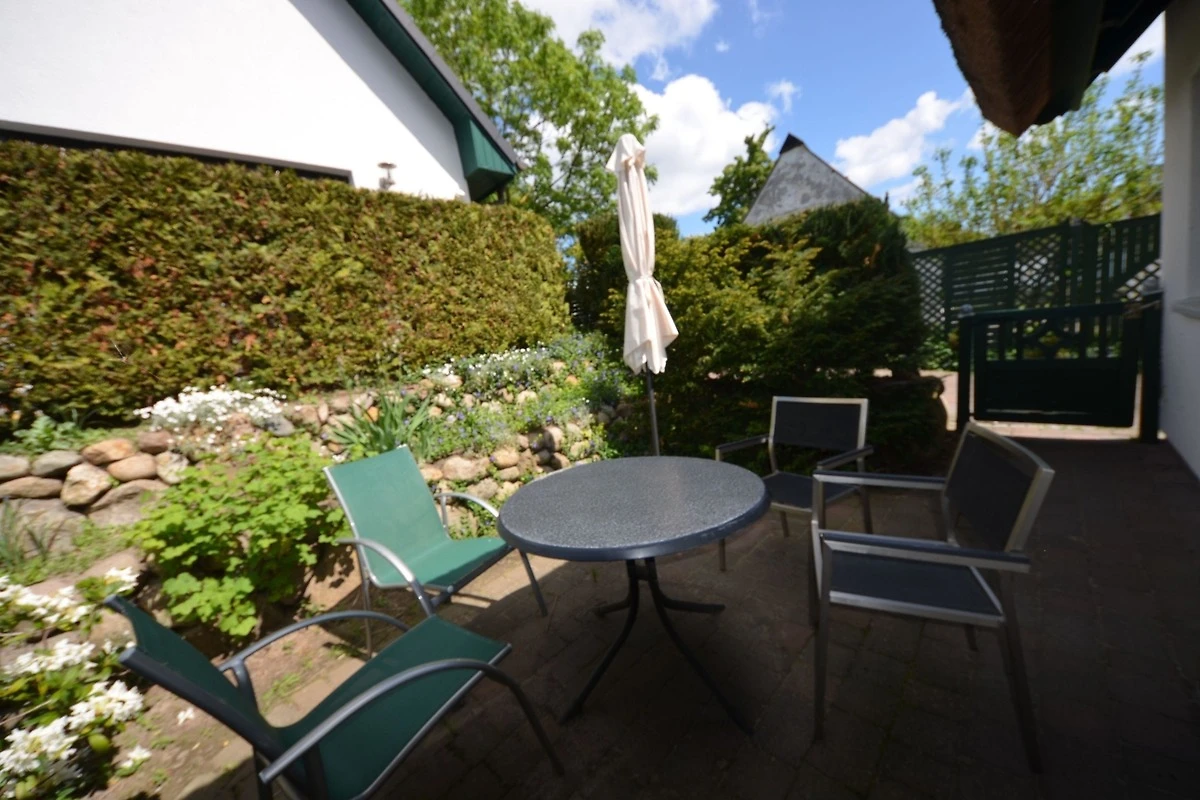 Vor der Haustür gibt es eine schöne eingewachsene Terrasse mit Gartenmöbeln.