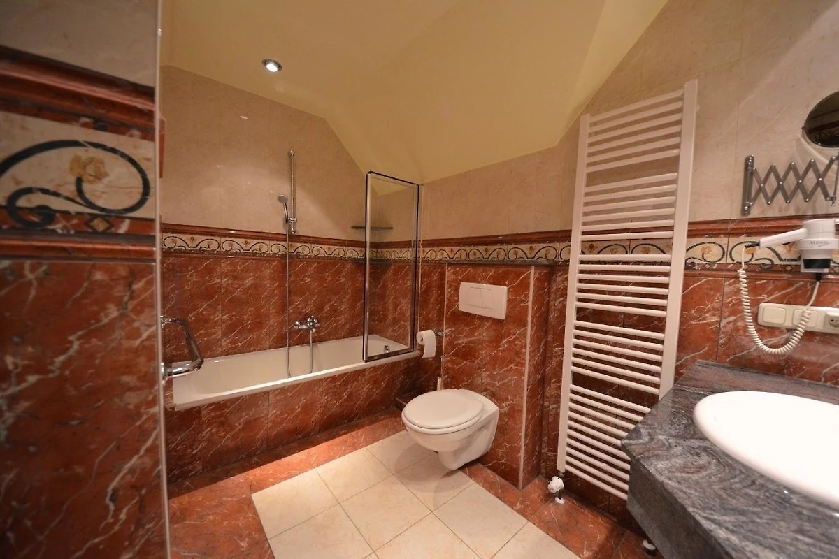 Wanne mit Glas-Duschwand, Fön, Schminkspiegel. Fussbodenheizung, Granit-Natursteinabdeckungen, schöne Sanitärausstattung in Pergamon, beheizbarer Handtuchhalter.