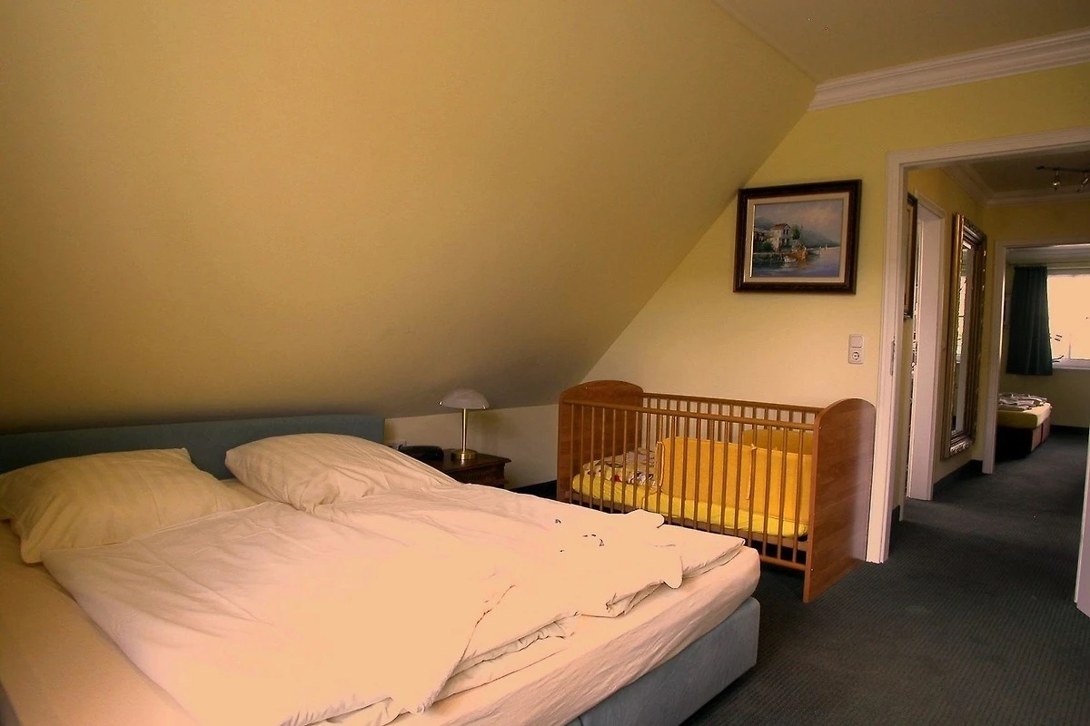 Babybett 70 x 140 (kostenlos) in einem der Schlafzimmer mit aufgezogener Bettwäsche.