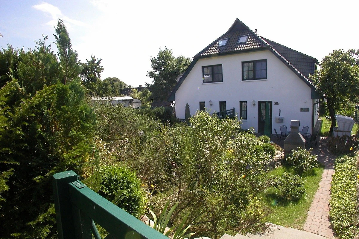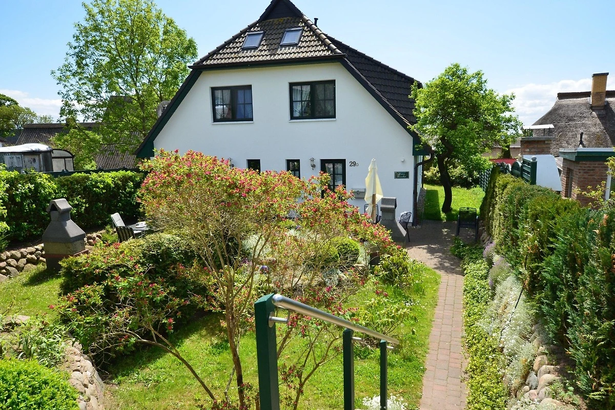 Das Haus hat einen eigenen separaten Eingang. Vor der Eingangstür befindet sich ein Garten mit Terrasse Gartenmöbeln und Strandkorb sowie ein Gartengrill.