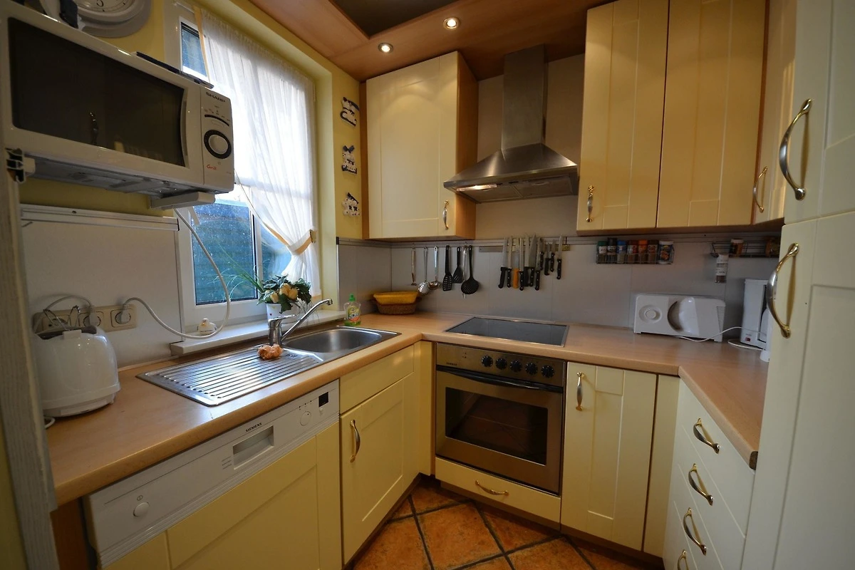Fussbodenheizung, schöne moderne Einbauküche in arktisgelb, Geschirrspüler, Mikrowelle,