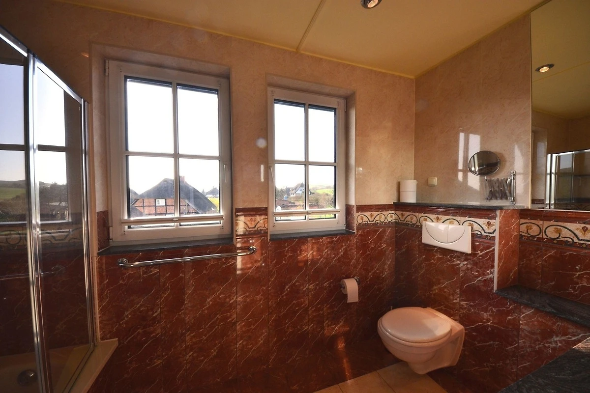 Fussbodenheizung, Natursteinabdeckungen, grossflächige Spiegel, schöne Sanitärausstattung, beheizbarer Handtuchhalter.