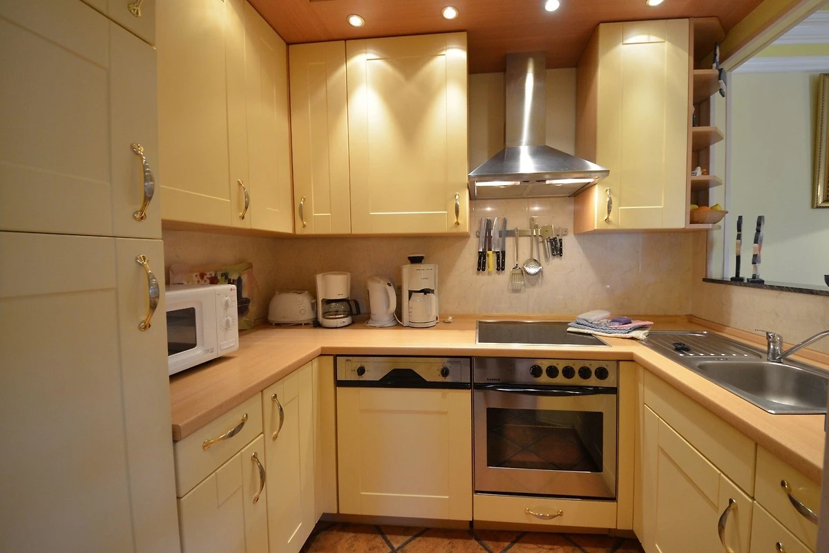 schöne vanillefarbene Landhaus-Einbauküche mit Geschirrspüler, Mikrowelle,