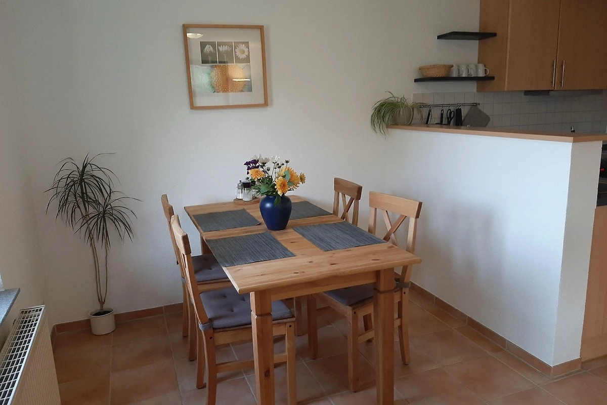 Unsere gemütliche Ferienwohnung im Neubau ist liebevoll und in einem modernen Landhausstil eingerichtet. Sie bietet Ihnen einen gemütlichen Wohn-Essbereich mit bequemer Couchgarnitur für entspannte Stunden und einem grossem Esstisch.