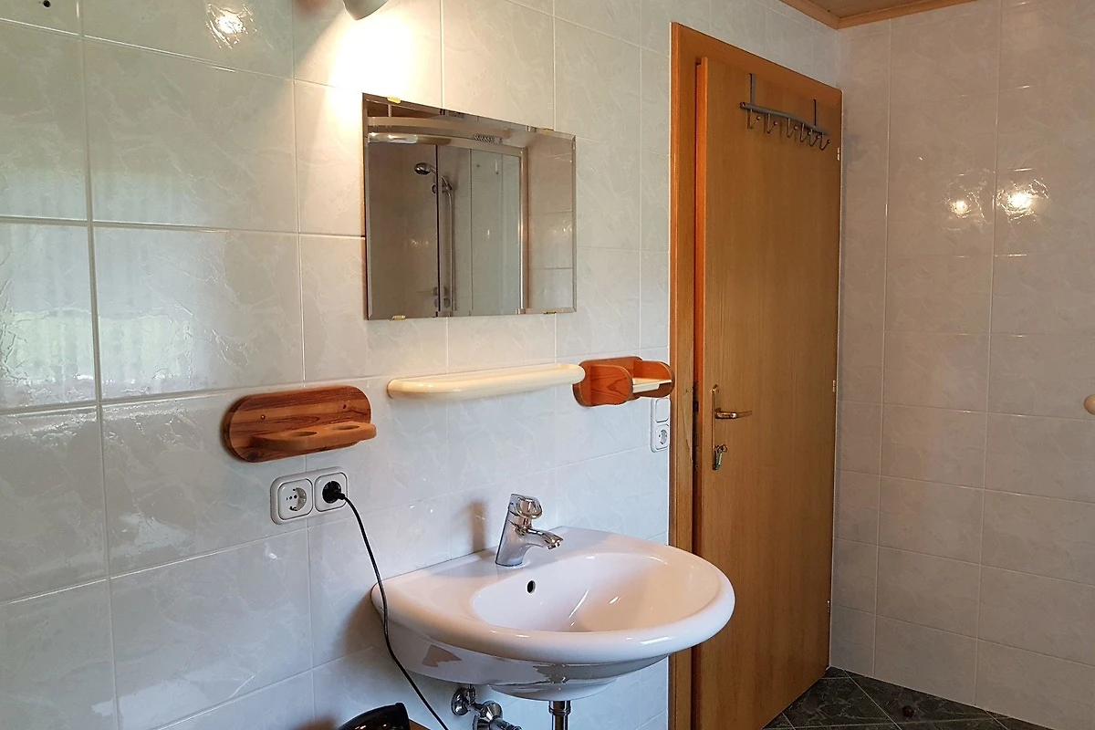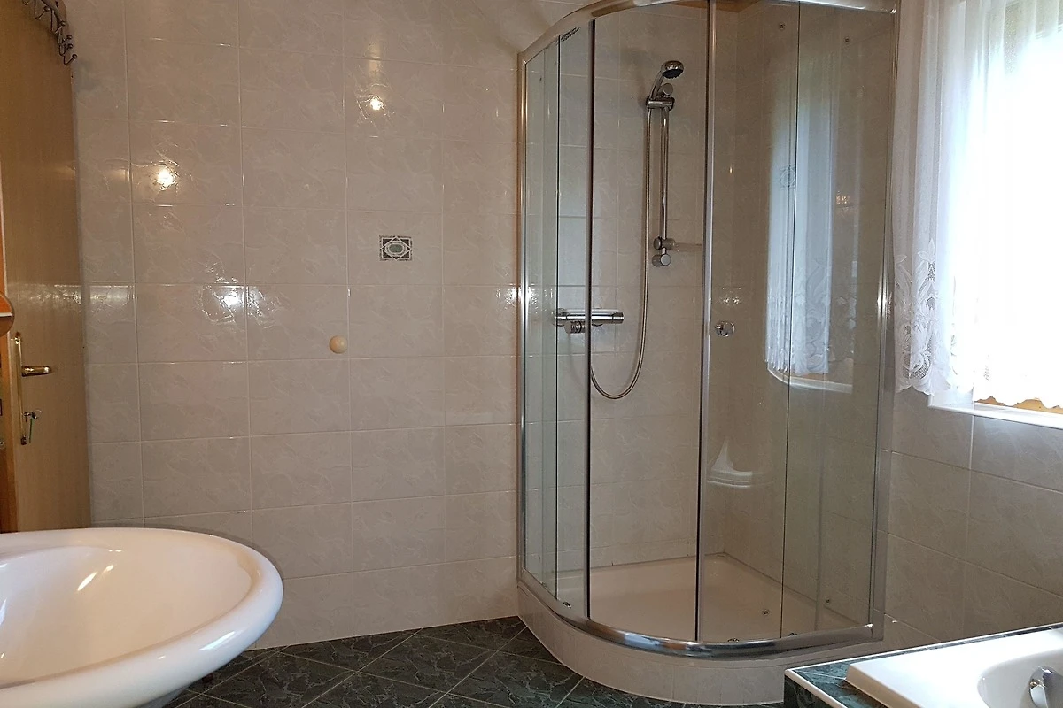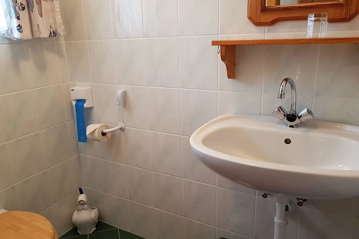 Das Bad ist mit einer Badewanne, Dusche und Waschbecken ausgestattet