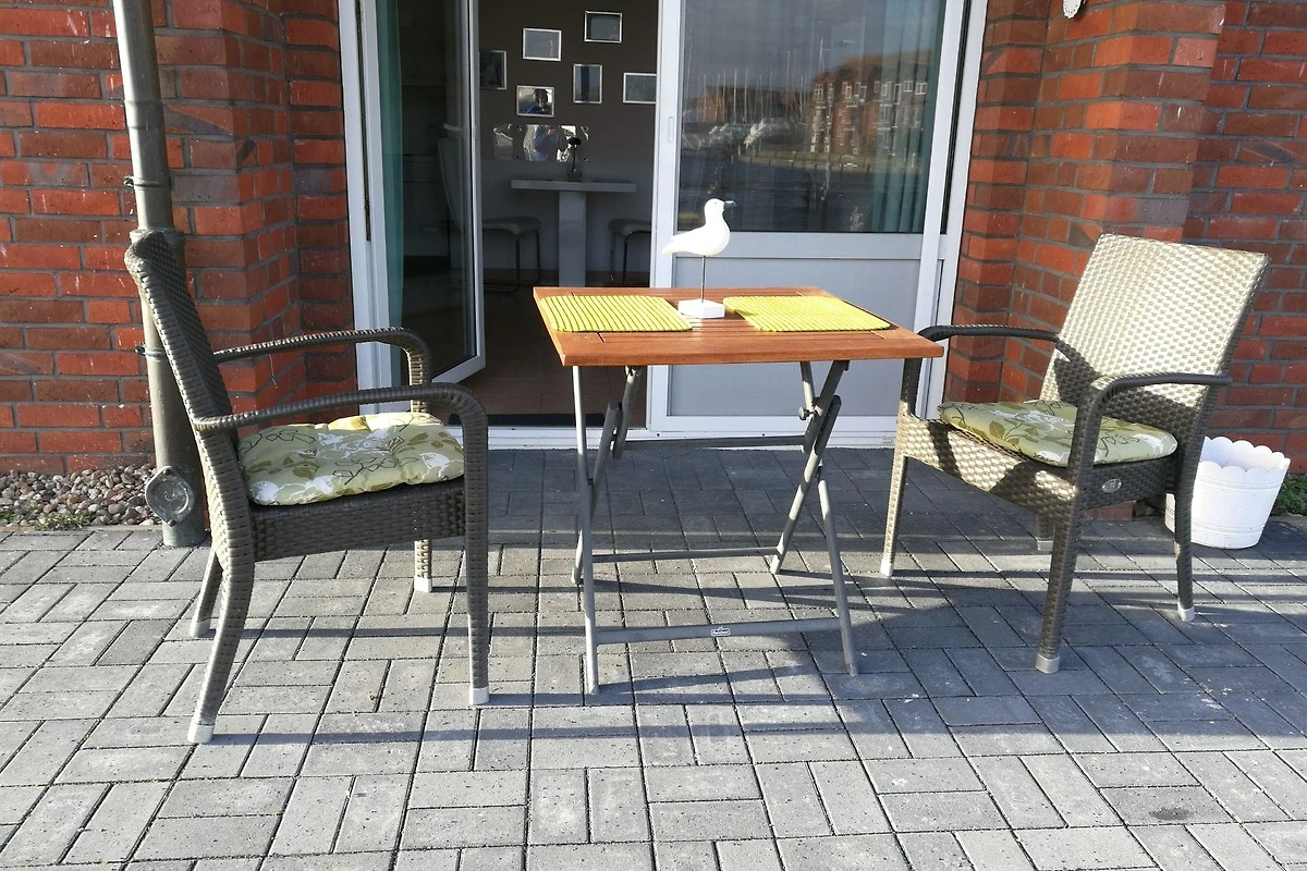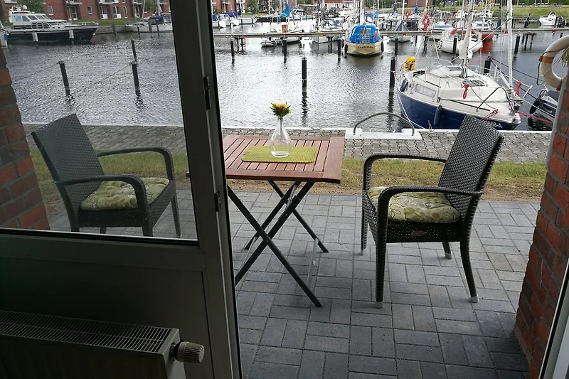 Zur Wohnung gehört eine Terrasse mit herrlichem Blick auf die Marina.