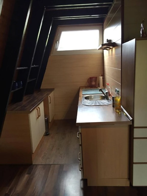Im unteren Stockwerk des Hauses befindet sich ein grosses Wohnzimmer mit einer Essecke sowie einer Küche. Vorhanden sind in dieser, neben einer Mikrowelle und einem Herd (inklusive Backofen) eine Kaffeemaschine und ein Wasserkocher. Auch Töpfe, Teller und Besteck sind vorhanden.