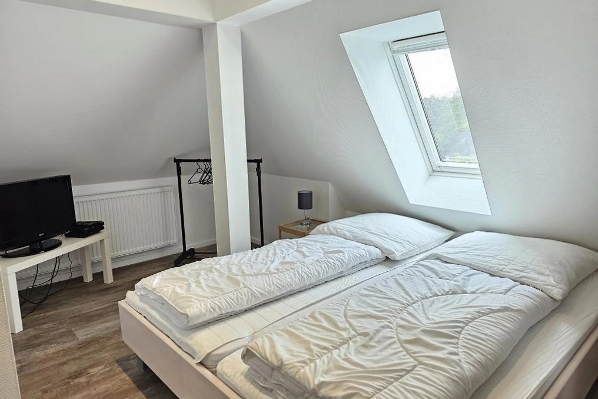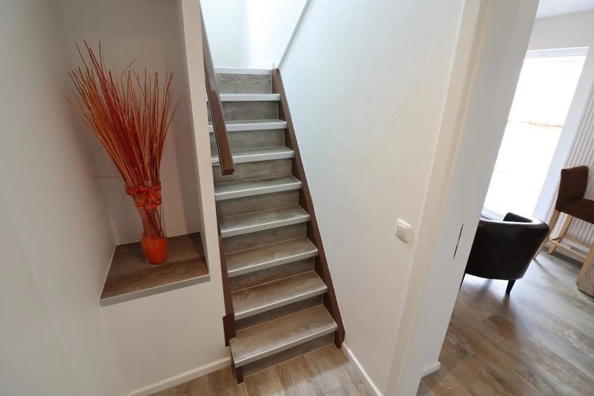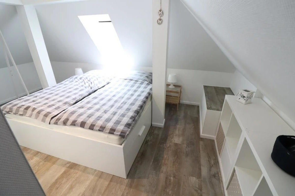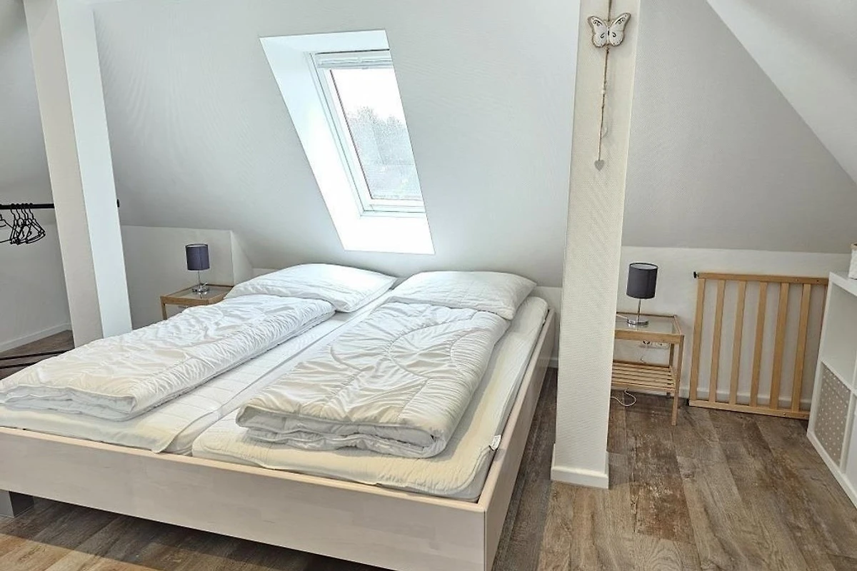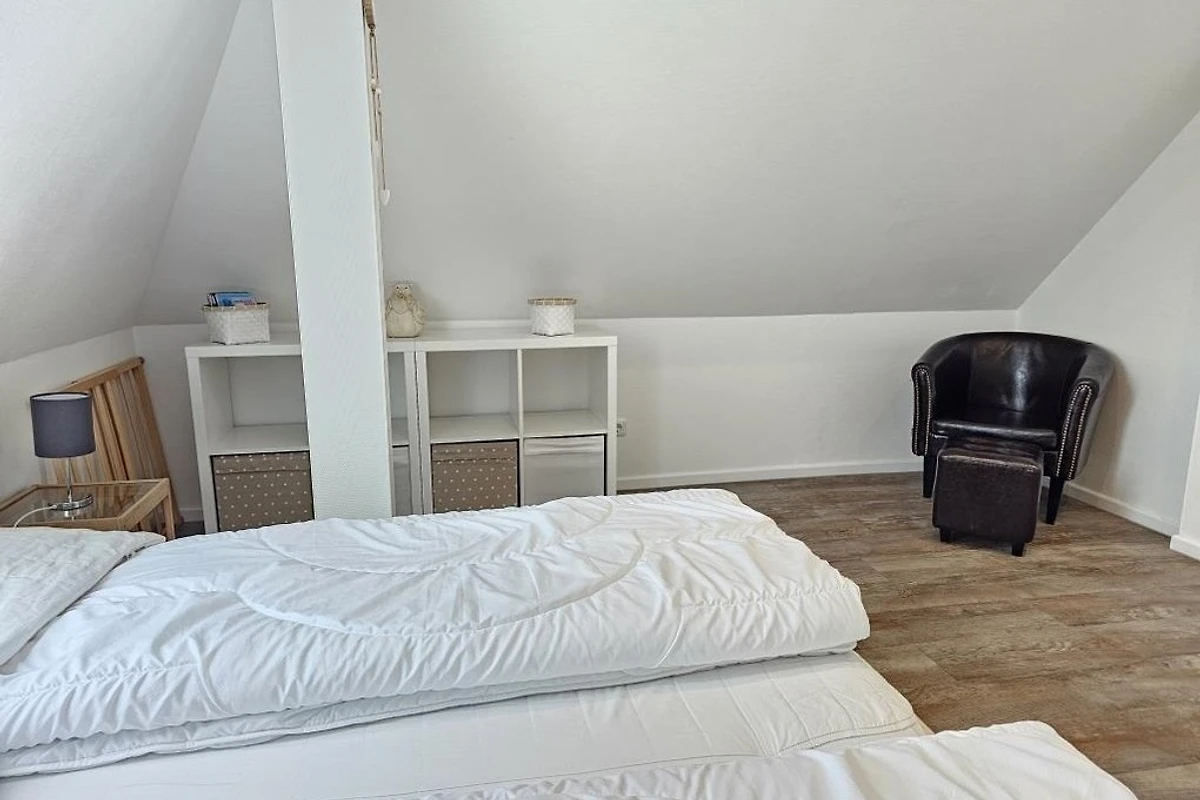 Renovierte Ferienwohnung im 1 OG und DG mit zwei Schlafräumen mit Doppelbetten 1,80mx2m (Schlafräume über Treppe zu erreichen =siehe Fotos), 1 Wohnraum mit Balkon, TV, Radio, neu renoviertes Bad mit Dusche / WC, Föhn, separates WC im Dachgeschoss, Küchenzeile mit Kühlschrank, Gefrierfach, Backofen und Geschirrspüler, Nichtraucher, WLAN kostenlos, Parkplätze am Haus, Gartennutzung, Fahrradunterstellmöglichkeit, Waschmaschine und Trockner gegen Gebühr vorhanden