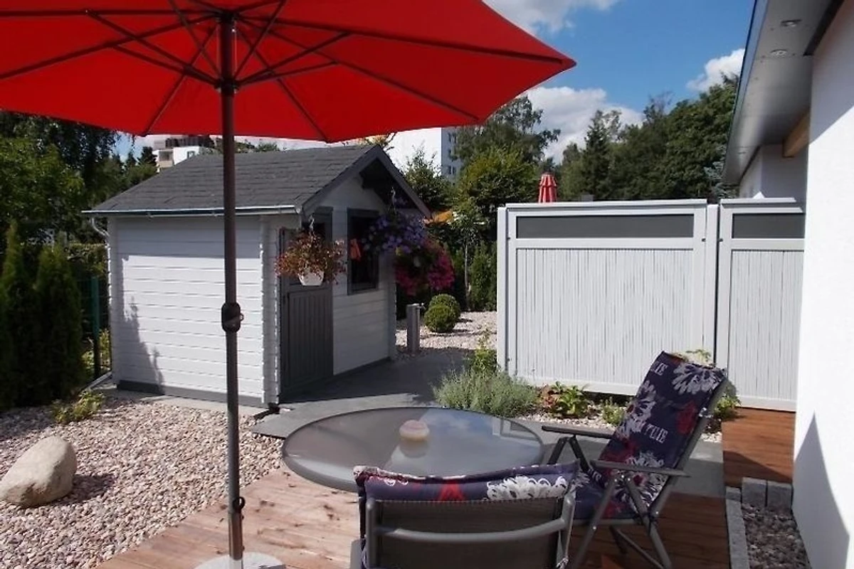 Zur Wohnung gehört ein Parkplatz und eine Terrasse mit Garten. Im Sommer ist die Terrasse mit gemütlichen Gartenmöbeln ausgestattet. Ein Grill für nette Abende ist auch vorhanden.
