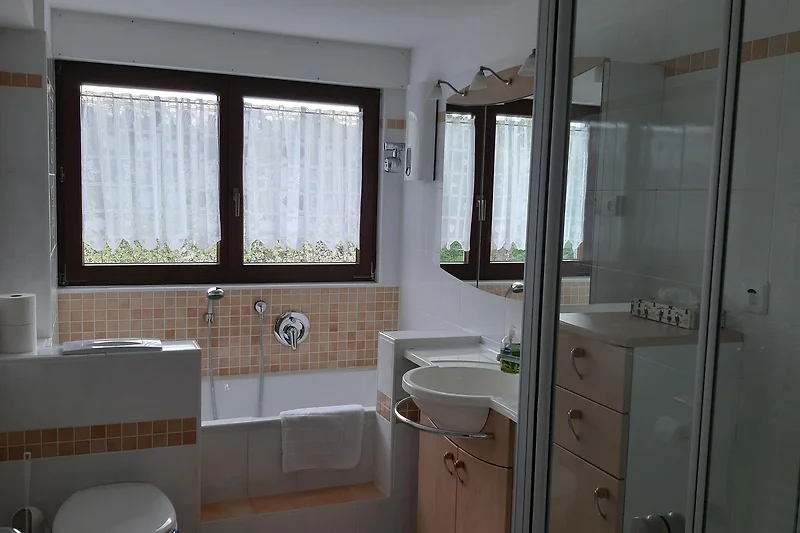 Das schöne Tageslicht- Bad verfügt über eine Badewanne, eine Dusche, grossen Spiegelschrank mit Waschbecken, WC, Handtuchtrockner, Fön und Fussbodenheizung. Der Spiegelschrank bietet reichlich Platz für Kosmetika und Ähnliches.