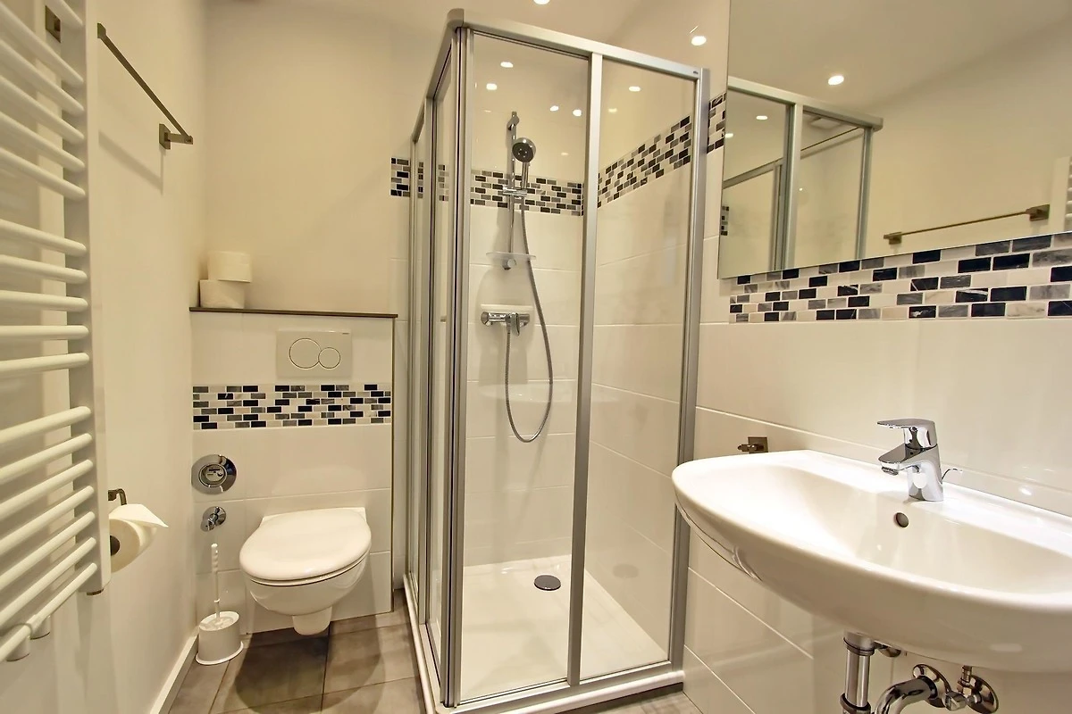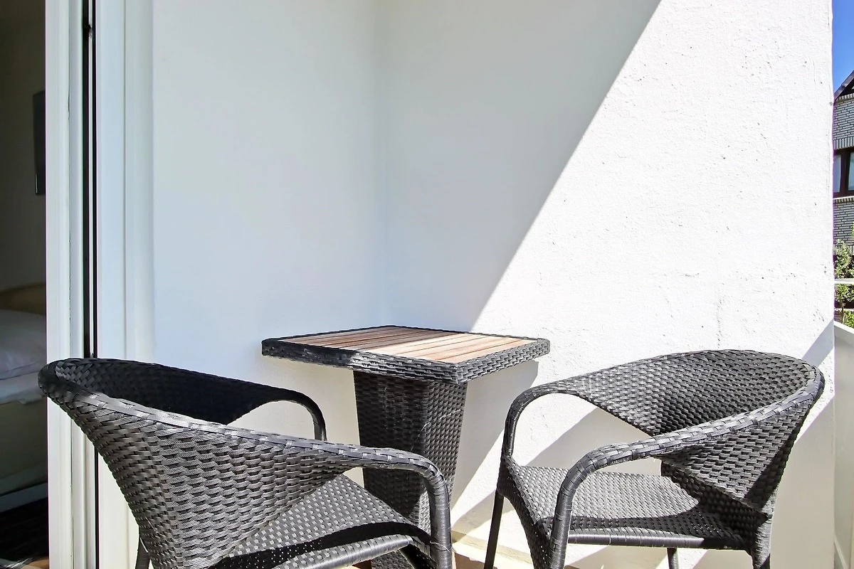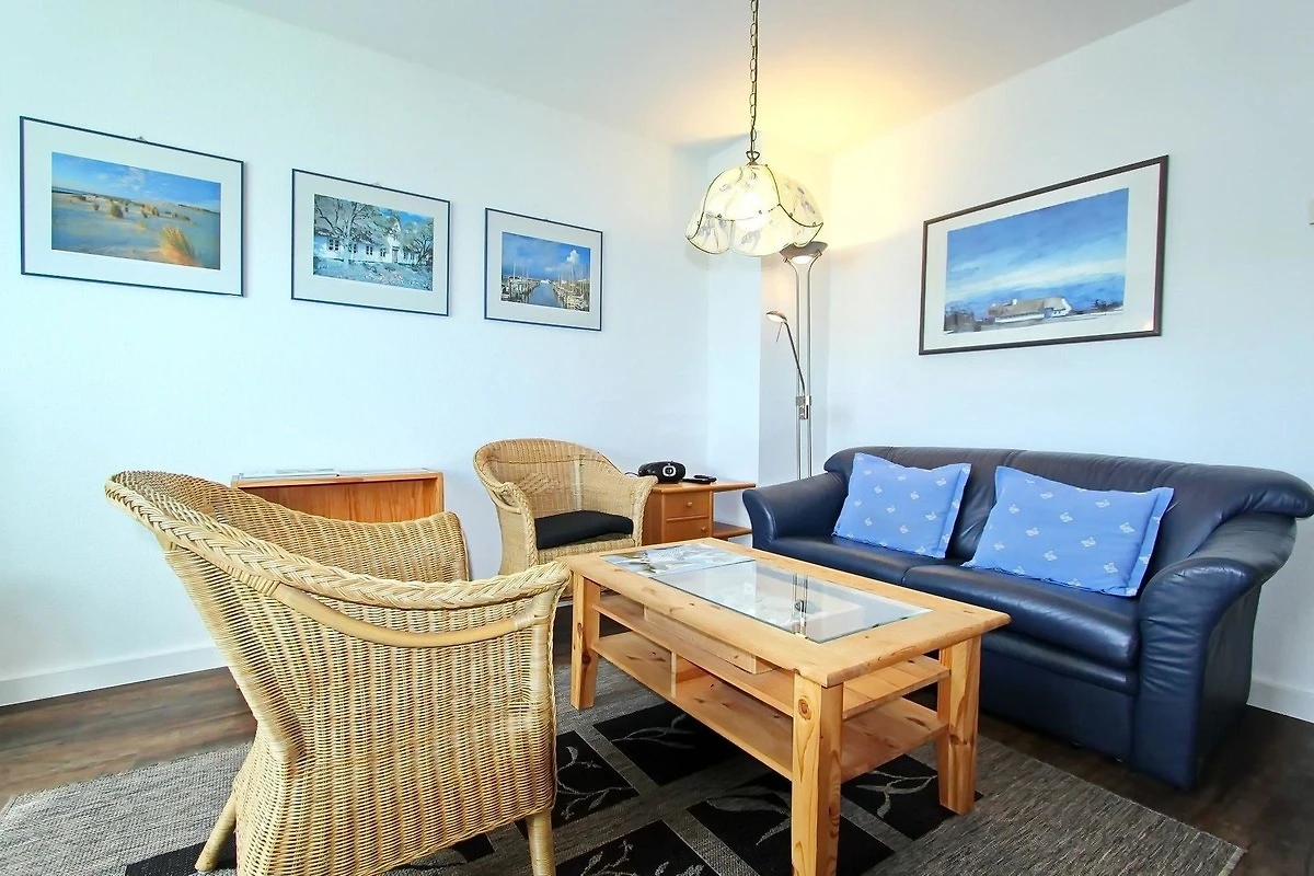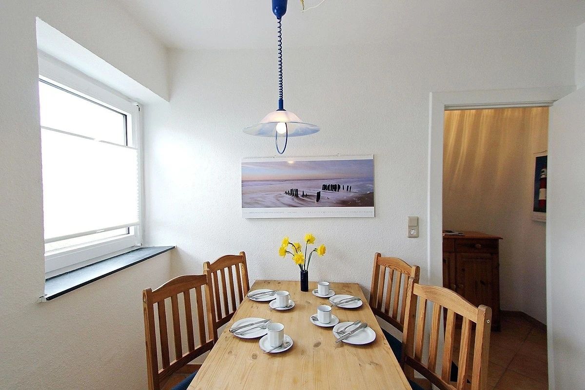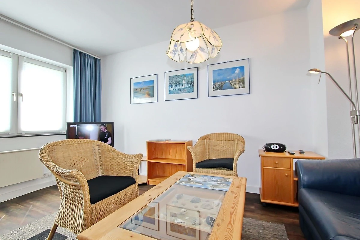 gepflegtes 2 Zi.-App. mit ca. 41 m² im Herzen von Hörnum. Die Nichtraucher Wohnung befindet sich im Hochparterre, in einem Mehrfamilienhaus, und bietet Platz für bis zu 4 Personen (max. 3 Erwachsene). Sie ist aufgeteilt auf ein Wohn-/Schlafraum mit einer gemütlichen Schlafcouch, Tisch, zwei Korbsessel, Vitrinen Schrank, Sat-TV und ein DVD-Player. Von Wohnzimmer gelangen zum kleinen Schlafzimmer mit einem Doppelbett (zwei Matratzen), einem grossen Kleiderschrank, der ausreichend Stauraum bietet, sowie den Zugang zum Südbalkon mit Balkonmöbel.