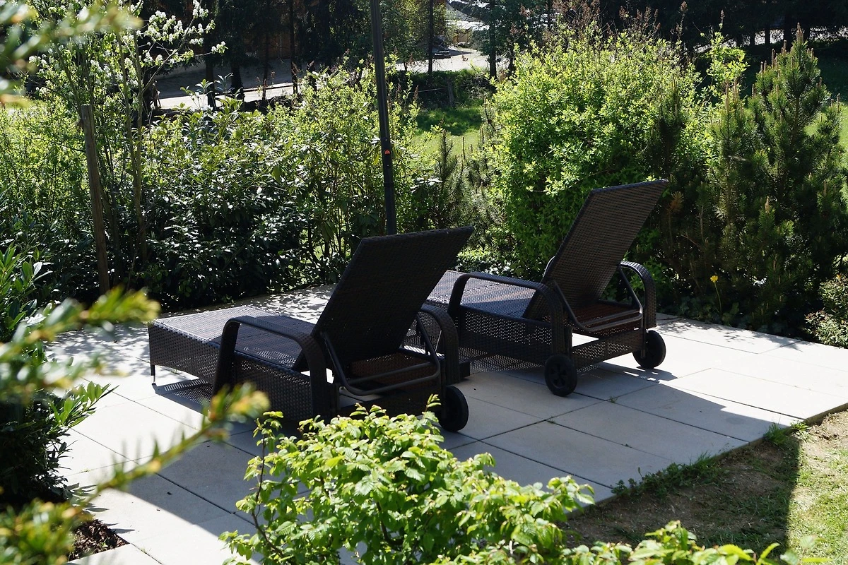 Grosse Terrasse mit Sonnenliegen und Gartenmöbeln
