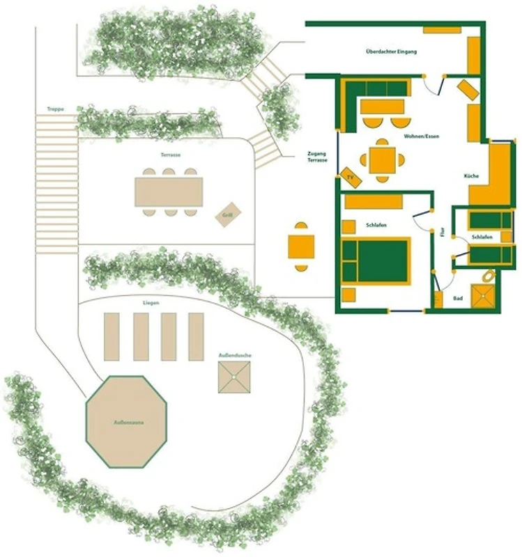 Aussensaunacota mit (kalter) Aussendusche und Liegeplatz