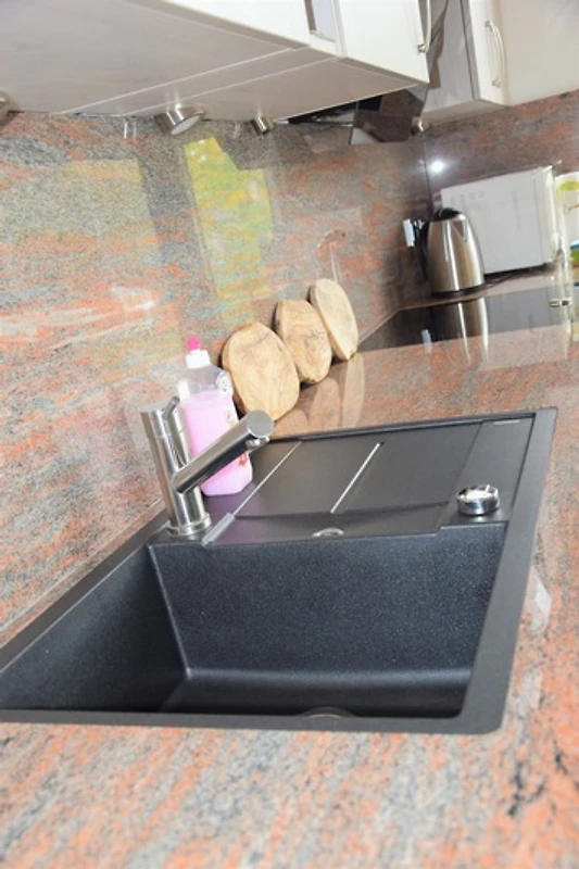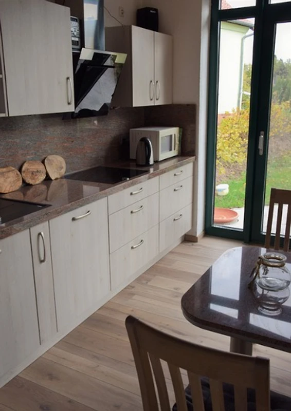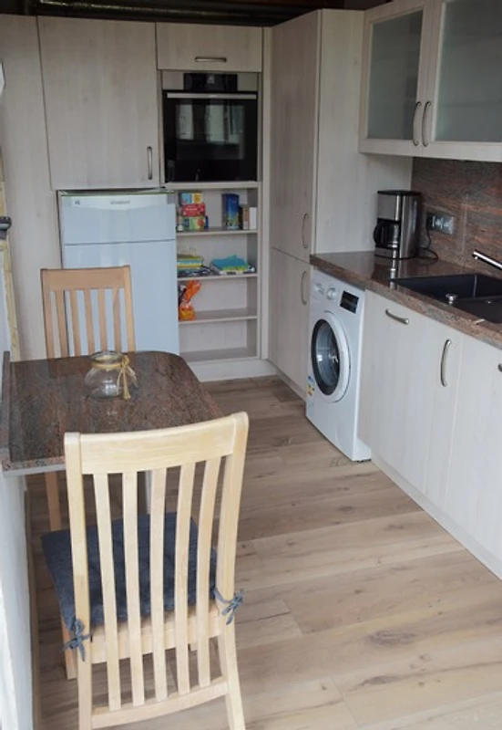 • die Küche ist ebenfalls geräumig mit einem Tisch und 2 Stühlen, einer sehr grosszügigen Küchenzeile mit riesigem Ceranfeld, Abzugshaube, Kaffeemaschine, Wasserkocher, Mikrowelle, Toaster, Kühl- Gefrierkombination und einem Backofen. Töpfe und Pfannen sowie Besteck, Geschirr und Gläser für 3 Personen sind vorhanden.