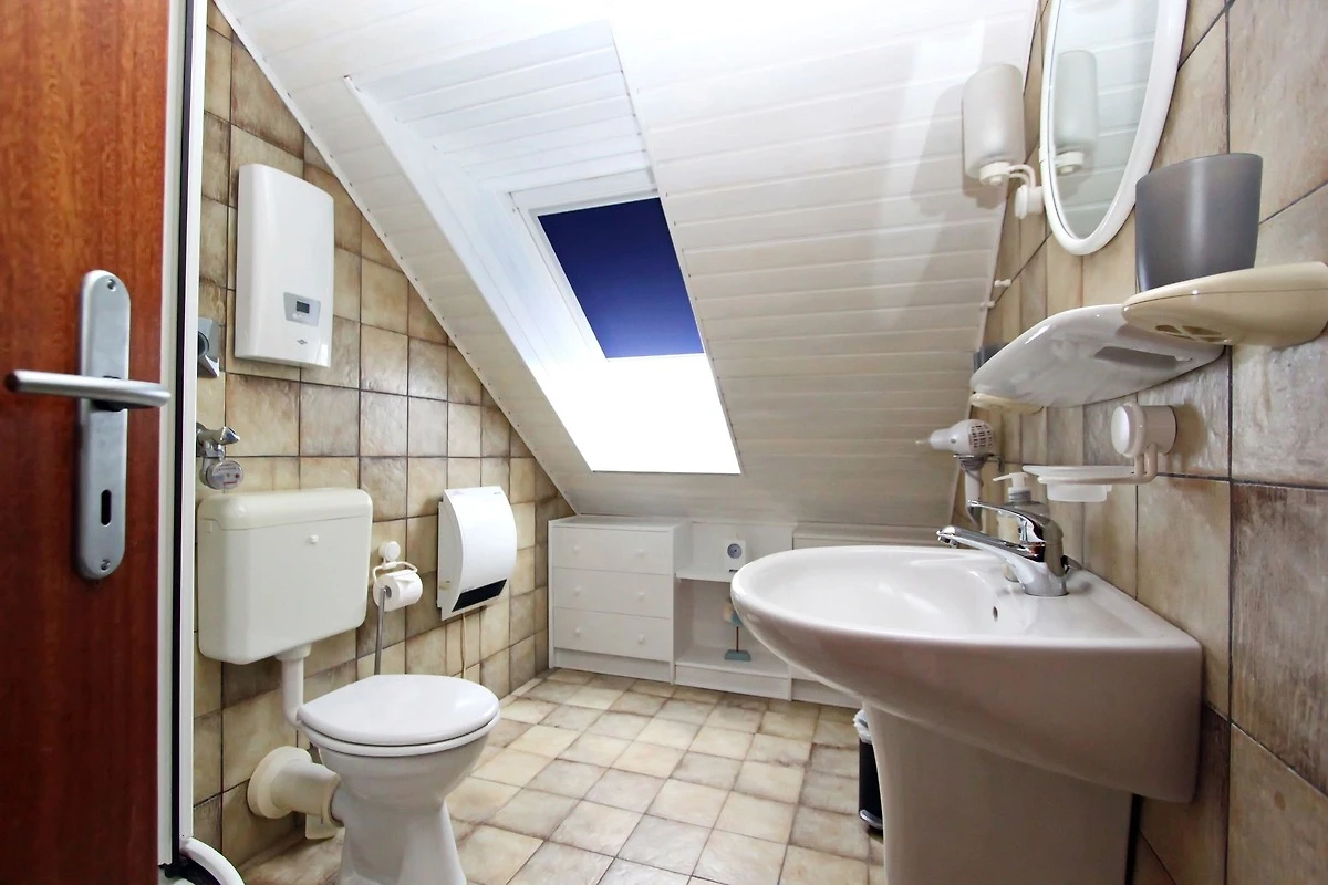 1 Schlafraum mit 2 Einzelbetten; Flur; Küchenzeile mit Cerankochfeld, Backofen, kleiner Geschirrspüler, Mikrowelle, Kühlschrank mit kleinem Gefrierfach; Duschbad/WC, Föhn.