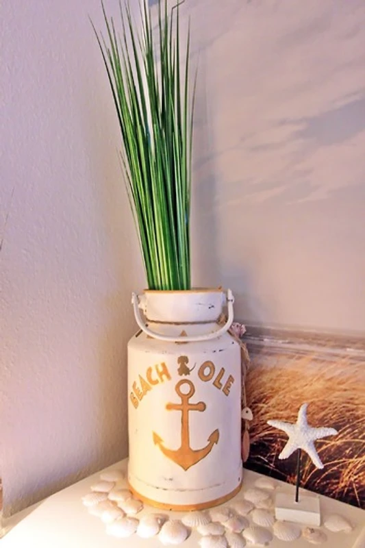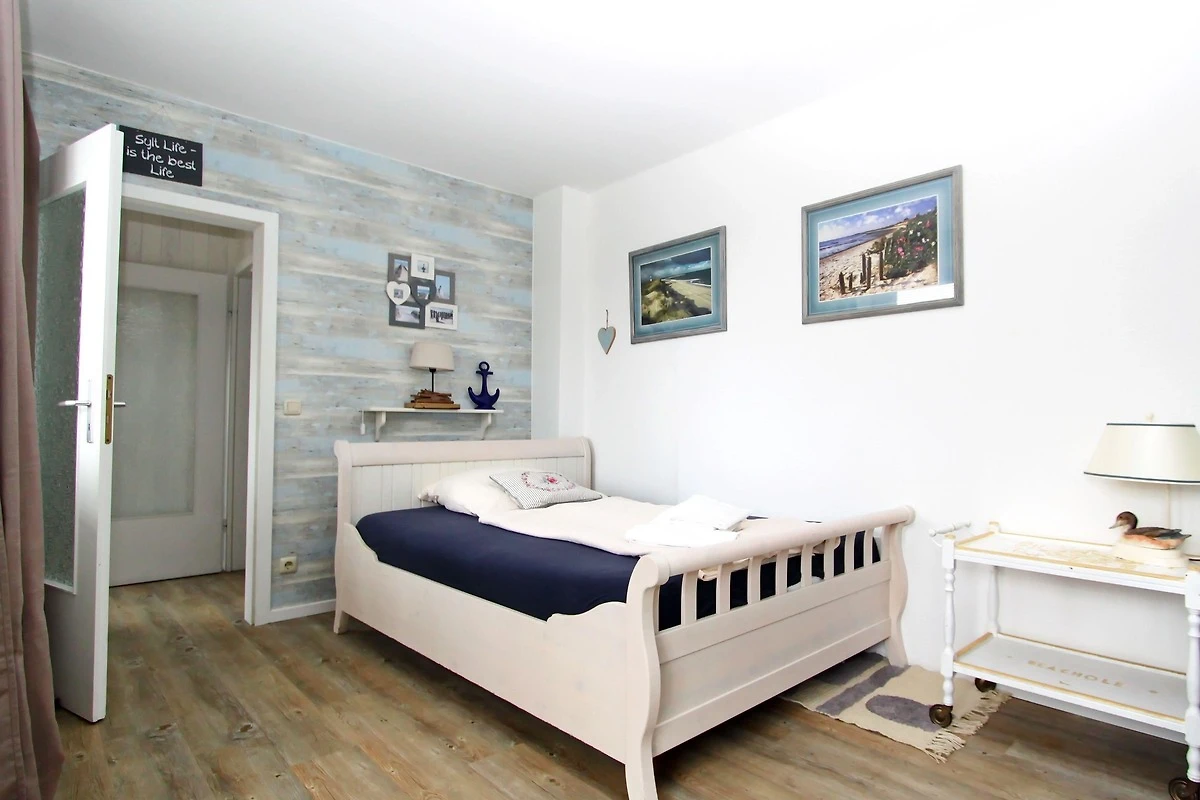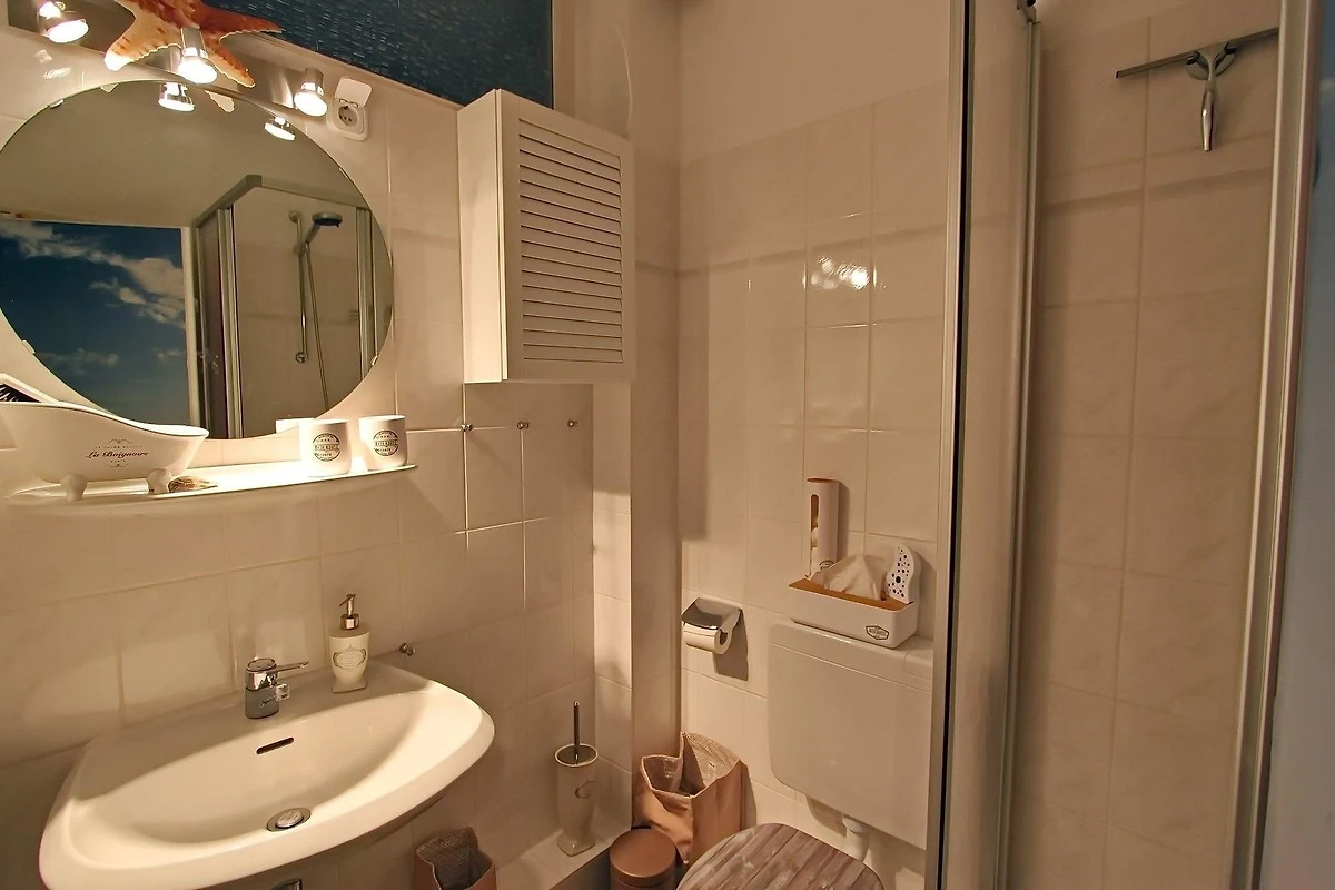 Die kleine Einbauküche verfügt über ein Cerankochfeld, Mikrowelle mit Grillfunktion, Kühlschrank mit kleinem Gefrierfach und allen Utensilien, die Sie benötigen, um sich selbst zu versorgen. An einem Esstisch mit zwei Stühlen können Sie Ihre Mahlzeiten einnehmen. Der Flur ist mit einer Garderobe und einem grossen Einbauschrank eingerichtet, der genug Stauraum bietet. Von dort gelangen Sie in das Duschbad mit WC. Im kompletten Appartement wurde Designfussbodenbelag verlegt. Viele, aufeinander abgestimmte, maritime Accessoires runden das Gesamtbild ab. Ein PKW-Stellplatz (Nr. 21) vor dem Haus gehört ebenfalls dazu. Sie haben im Wirtschaftsraum die Möglichkeit, Ihre Wäsche zu waschen und ggf. zu trockenen (mit Münzzähler).