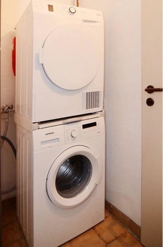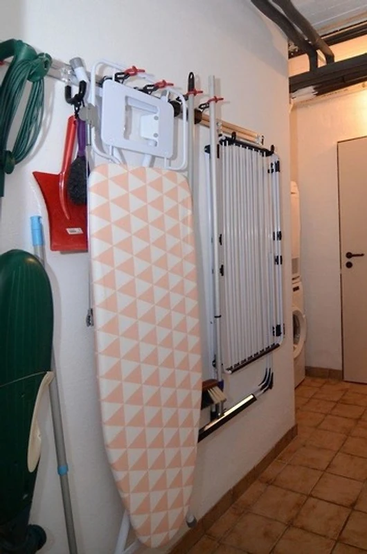 hier steht eine Waschhmaschine und Trockner zur Verfügung. Ein Regal für Vorratshaltung und zusätzlich ein kleiner Tiefkühlschrank sowie eine Dampf-Bügelstation..