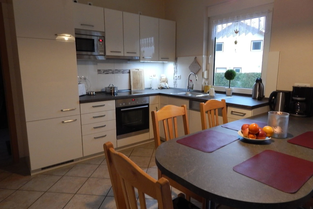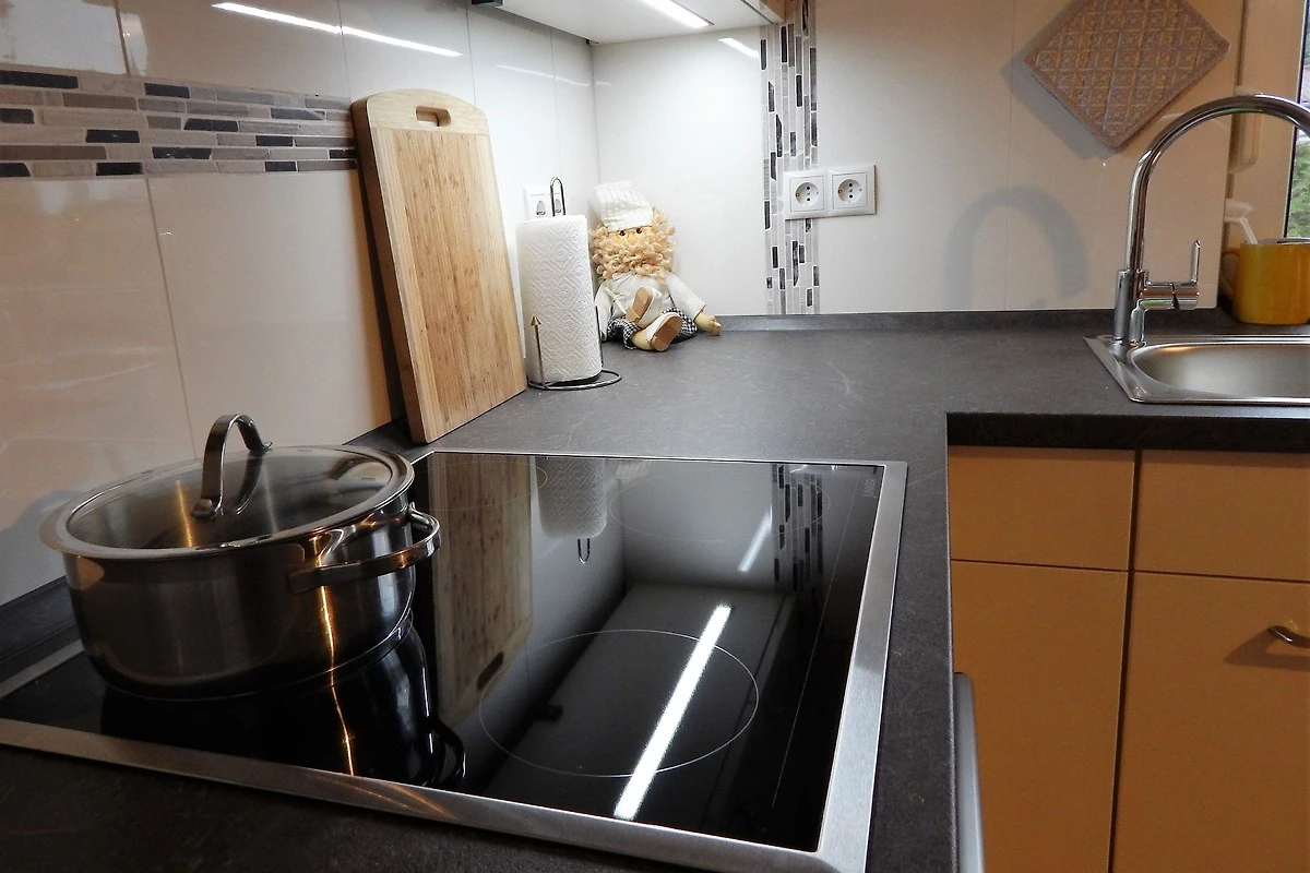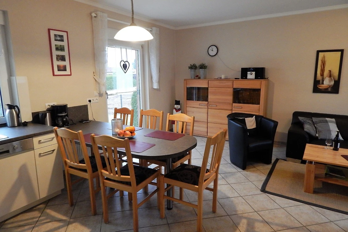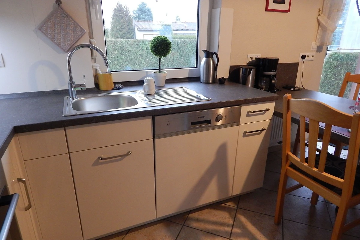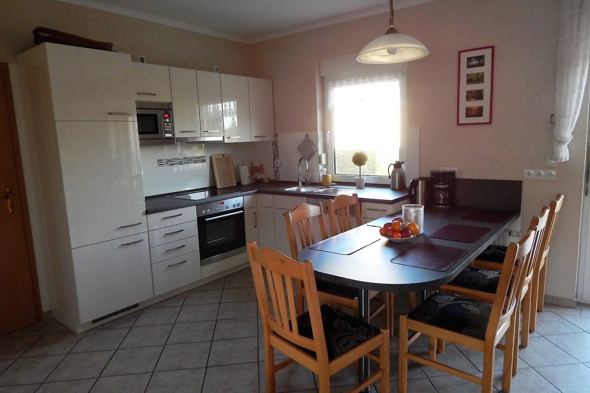 Die Küche ist mit einer modernen Einbauküche mit Mikrowelle, Spülmaschine und Backofen ausgestattet. Der Wohnbereich verfügt über eine gemütliche Eckcouch und 2 Sessel.