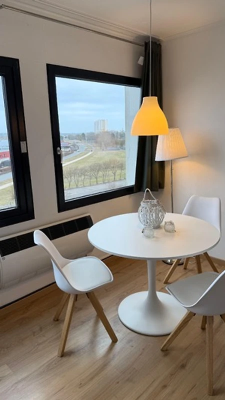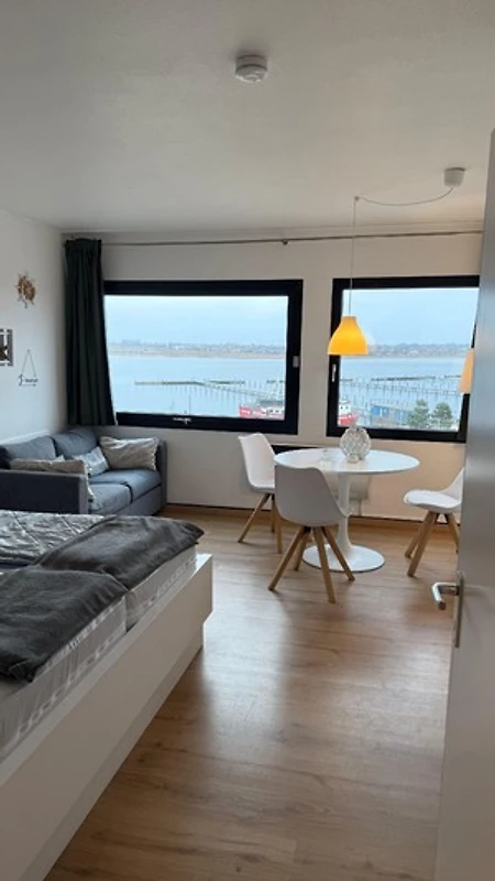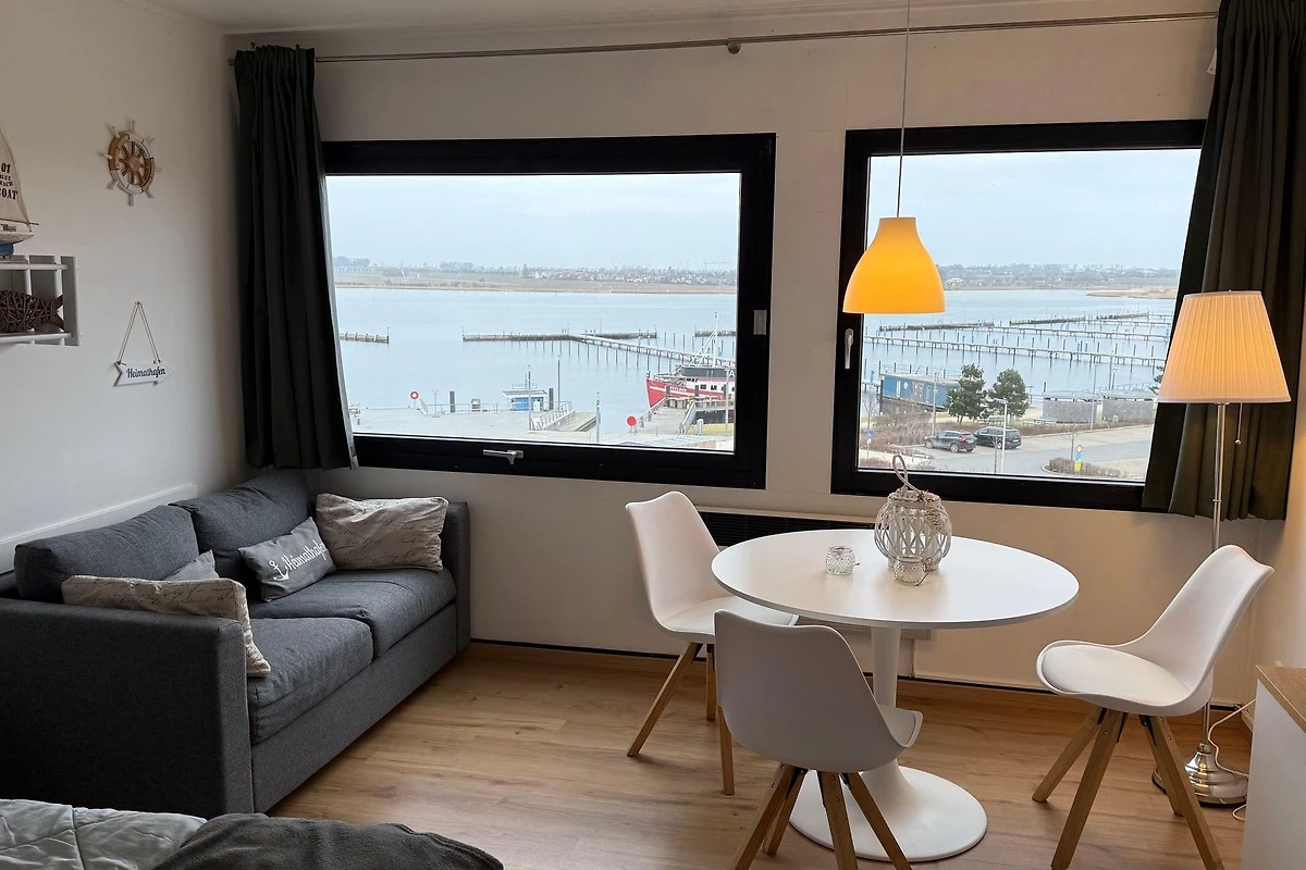 Mit dem Fahrstuhl in die 4. Etage (Endetage). Dort erwartet Sie ein gepflegtes und gemütlich eingerichtetes Appartement mit herrlichem Blick auf den Yachthafen.