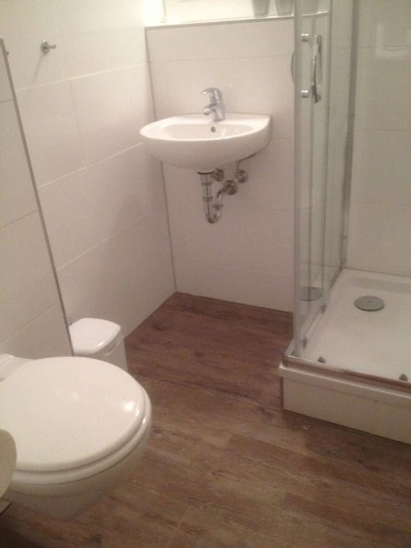 Das Duschbad ist hell und modern. Sie finden einen Schrank und Ablageflächen; selbst Ihren Fön können Sie zuhause lassen. Ein Handtuch-Heizkörper und eine Wäschespinne sind vorhanden.