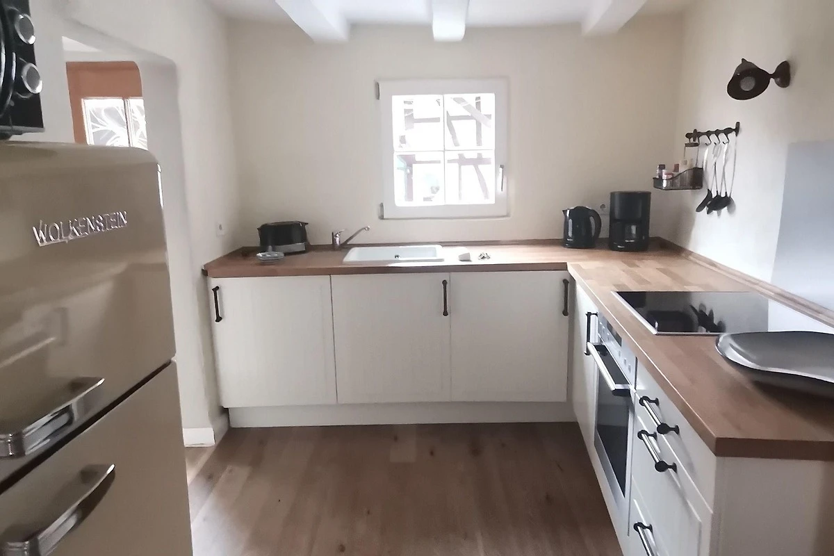 1. Küche: Ofen, Herd, Kühlschrank, Mikrowelle, Kaffeemaschine, Wasserkocher, Toaster