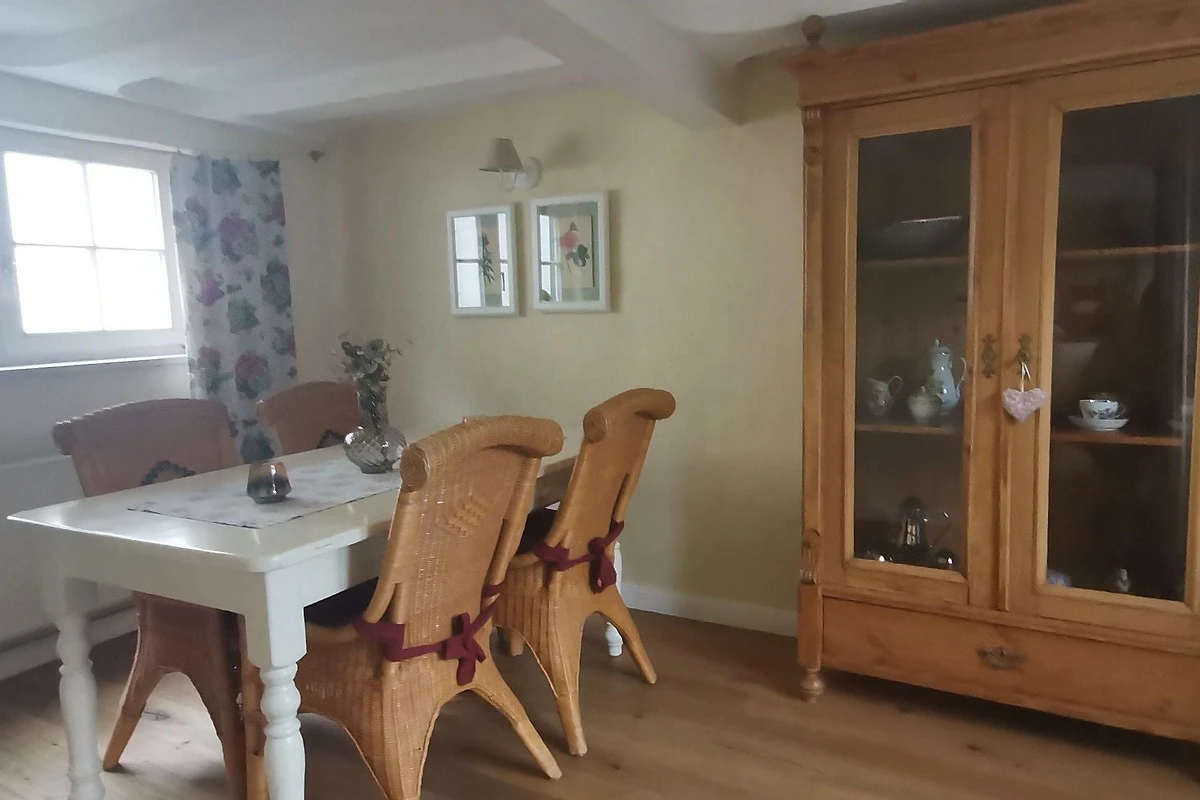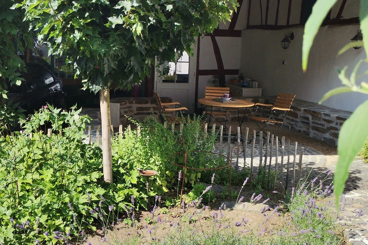 Auch bei regnerischem Wetter lädt der liebevoll gestaltete Innenhof zu gemütlichen Stunden ein, da ein Teil der Sitzecke überdacht ist. Der Innenhof wird zur Mitbenutzung angeboten.