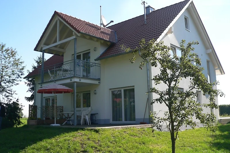 An einem grossen Garten mit altem Baumbestand befindet sich das Ferienhaus mit 2 grosszügigen Wohnungen für bis zu 5 Personen Platz. Beide Wohnungen verfügen über zwei Schlafzimmer mit Doppel- bzw. Einzelbetten, einem kombinierten Wohn- und Essbereich mit voll ausgestatteter Küche und einem grossen Bad mit Dusche. Die obere Wohnung besitzt ferner einen grossen Balkon, die untere eine Terasse mit Zugang zum Garten.