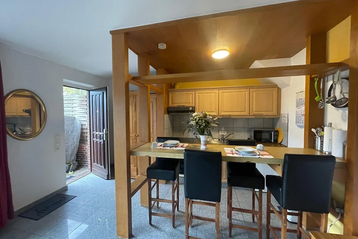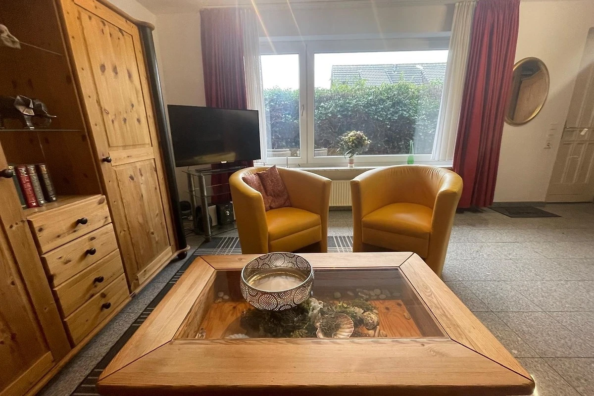 Die Wohnung im EG liegt in zweiter Reihe und ist sehr ruhig gelegen. Sie hat eine kleine Terrasse, Gartenmöbel und einen Strandkorb. Auch ein fester Parkplatz ist auf dem eigenen Grundstück für Ihren Wagen da.